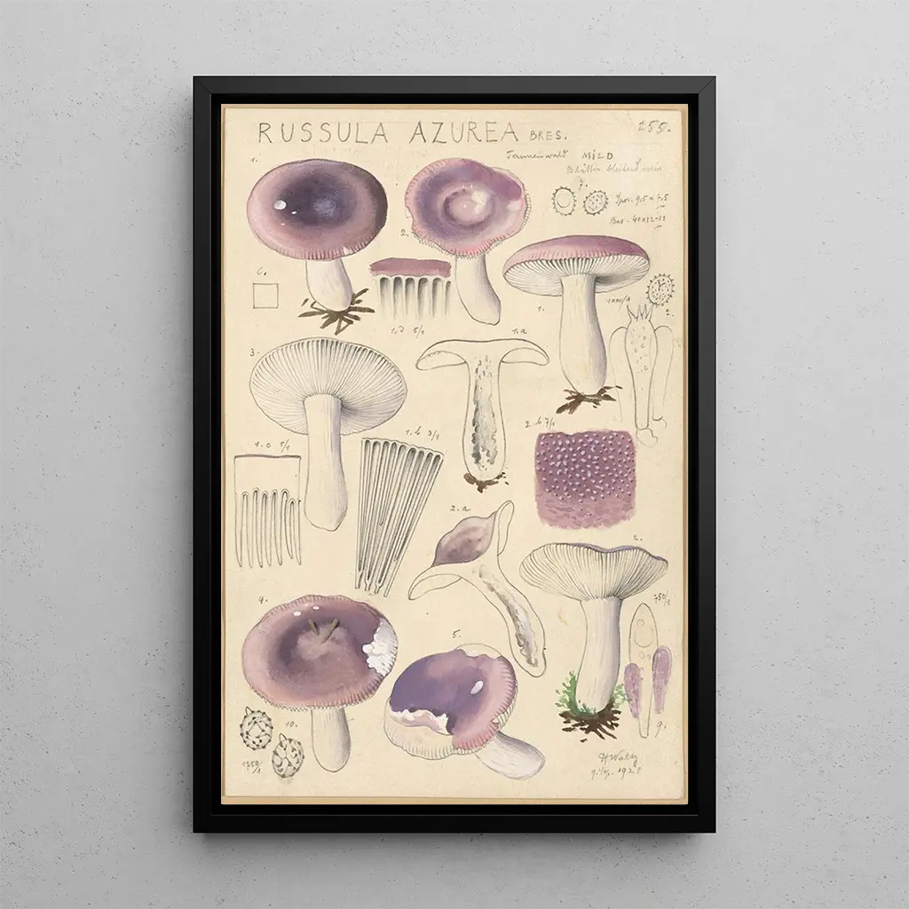 L taidegrafiikan reproduktio Russula azurea, Hans Baldungin teos, on todellinen juhla biodiversiteetistä. Tämä maalaus, rikas sinisissä ja vihreissä sävyissä, viittaa metsänalusten raikkauteen ja sienten taikuuteen. Baldungin tekniikka, joka yhdistää tarkkuuden ja ilmaisullisuuden, herättää tämän sienten lajin eloon, tehden siitä lähes kosketeltavan. Tämän teoksen välittämä tunnelma on sekä rauhoittava että kiehtova, kutsuen katsojan sukeltamaan luonnon salaperäiseen maailmaan. Jokainen yksityiskohta, huolellisesti maalattu, kertoo taiteilijan rakkaudesta aiheeseensa.
