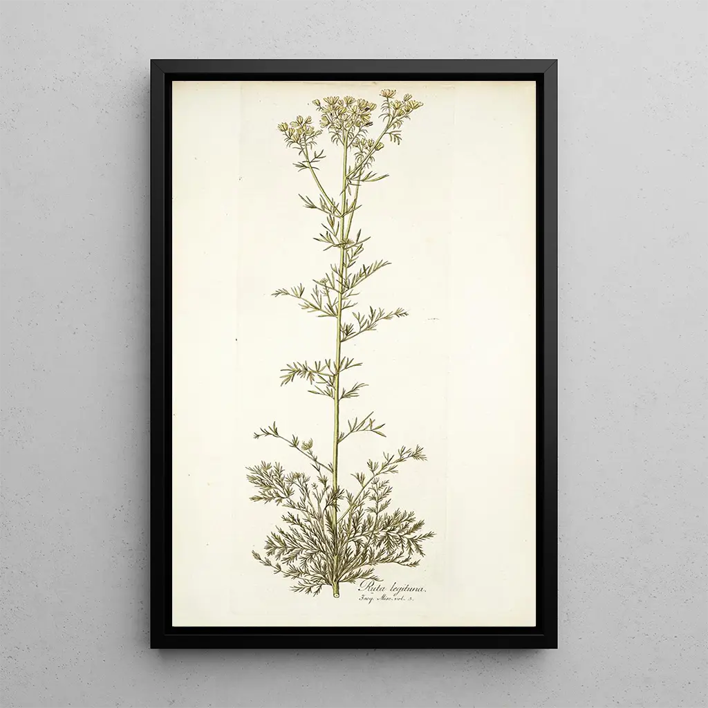 La taidegrafiikka de Ruta legitima, œuvre emblématique de Nikolaus Joseph Freiherr von Jacquin, nous transporte dans l'univers fascinant des plantes médicinales. Cette illustration, riche en détails, met en lumière les feuilles et les fleurs de la rue, une plante aux vertus reconnues depuis l'Antiquité. Les teintes vertes vibrantes et les touches de jaune illuminent la composition, créant une atmosphère à la fois apaisante et vivifiante. La technique de l’aquarelle, maîtrisée par Jacquin, permet de capturer la délicatesse des formes et la transparence des couleurs, invitant le spectateur à explorer la beauté de la nature sous un angle scientifique et artistique.