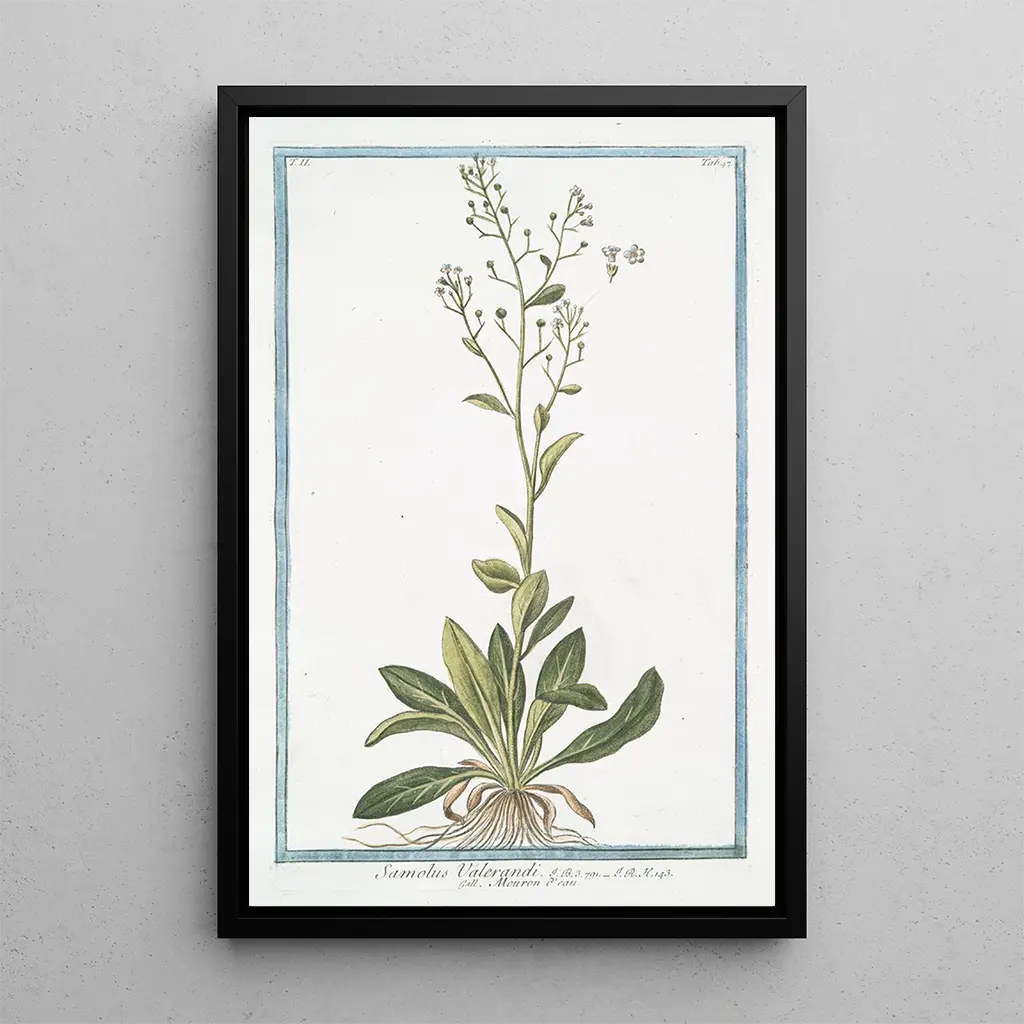"Samolus Valerandi Mouron d'eau" -taidegrafiikan reproduktio on koristeellinen valinta, joka rikastuttaa mitä tahansa tilaa. Olipa kyseessä toimisto, olohuone tai makuuhuone, tämä kangas tuo luonnon ja rauhan tunnelman sisälle. Tulostuksen laatu takaa täydellisen yksityiskohtien ja värien uskollisuuden alkuperäisteokselle, samalla tarjoten esteettisen viehätyksen. Sisällyttämällä tämän teoksen sisustukseesi luot rauhoittavan ja inspiroivan ilmapiirin, joka on ihanteellinen rentoutumiseen ja luonnon kauneuden arvostamiseen. Tämä teos viehättää taiteen ja kasvitieteen ystäviä.