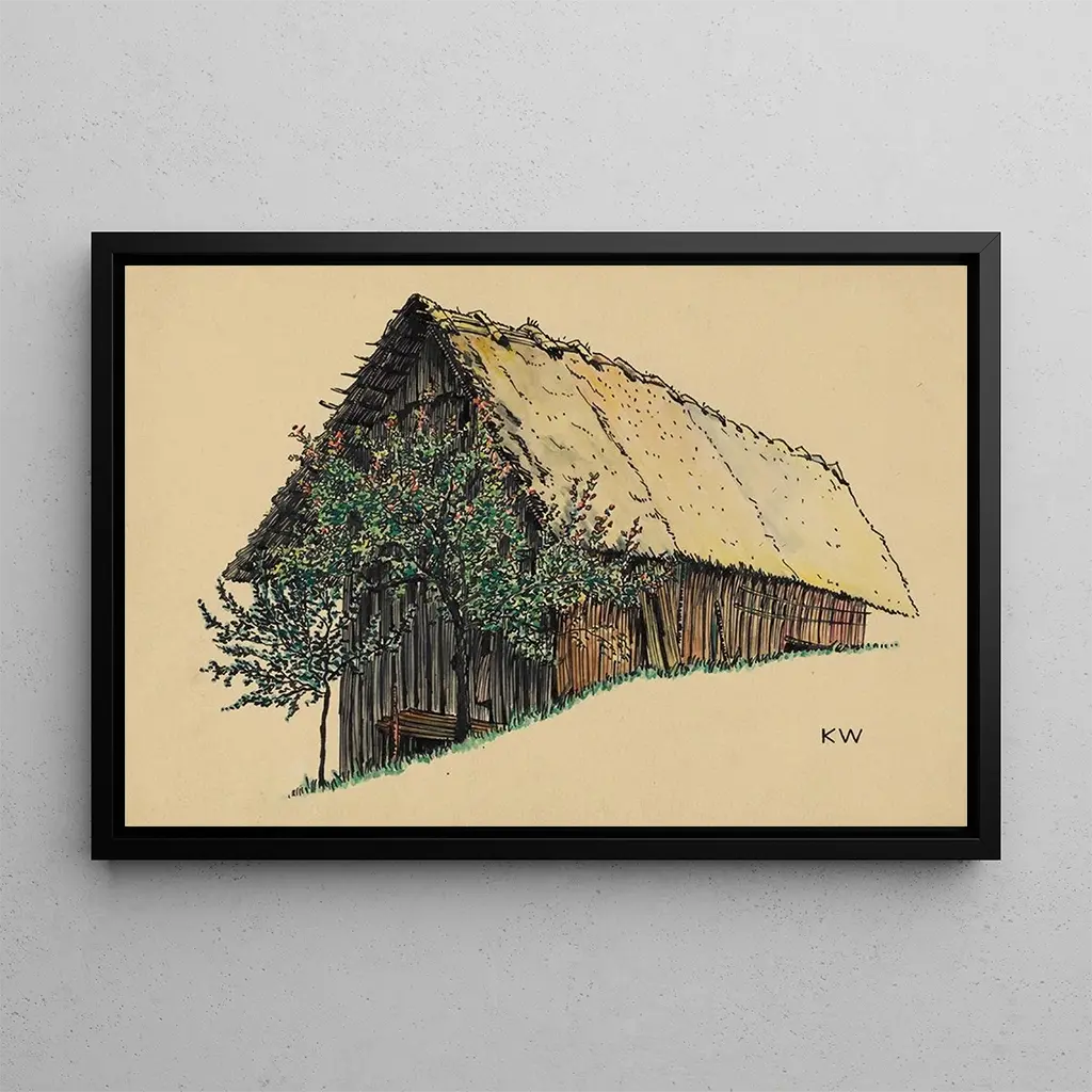 La reproduction de "Sans titre, grange en bois" de Karl Wiener évoque une atmosphère paisible et intemporelle. La toile dépeint une grange en bois, symbole de la vie rurale, avec des couleurs terreuses qui se fondent harmonieusement dans le paysage environnant. Les nuances de brun et de vert créent une ambiance chaleureuse, tandis que la technique de Wiener, qui mêle réalisme et impressionnisme, donne vie à cette scène bucolique. L'œuvre invite à une contemplation sereine, où chaque détail, du bois vieilli aux ombres projetées, raconte une histoire de tradition et de nature.