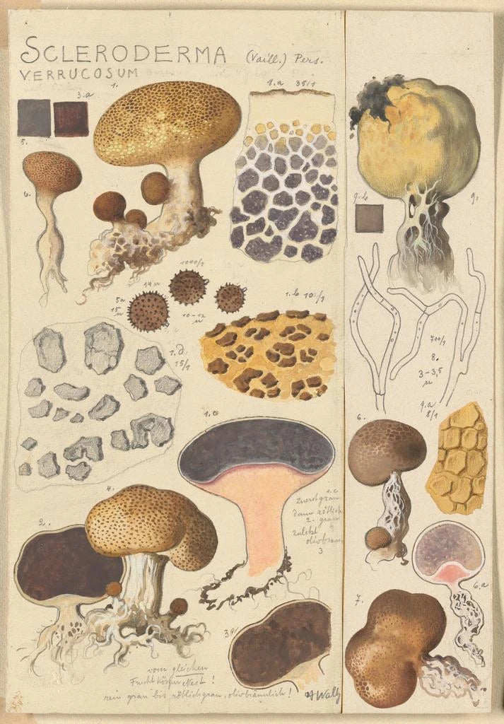 Scleroderma verrucosum, œuvre emblématique de Hans Baldung, nous invite à explorer la richesse et la diversité du monde fongique. Cette représentation artistique présente un champignon aux formes singulières, dont la texture rugueuse et les teintes variées captent immédiatement l’attention. Les couleurs, allant des gris subtils aux bruns chauds, créent une atmosphère à la fois mystérieuse et familière. La technique de Baldung, qui allie précision et expressivité, donne vie à ce sujet naturel, transformant une simple étude en une véritable œuvre d’art. L'œuvre incite à une contemplation attentive, révélant la beauté cachée de la nature.