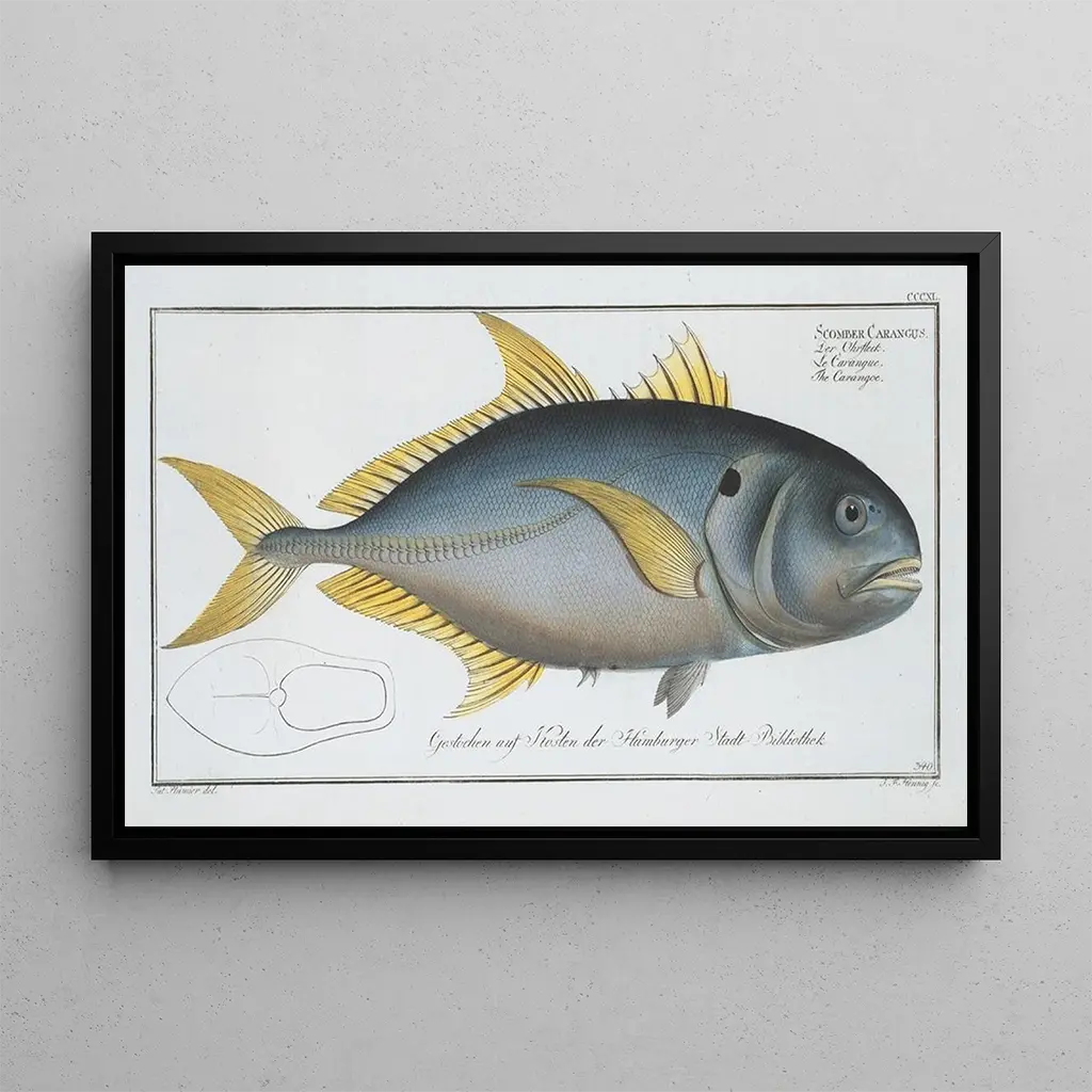 La reproduction Scomber carangus, le carangue, de Marcus Elieser Bloch, dévoile une représentation fascinante de ce poisson emblématique. Les nuances de bleu et d'argent, associées à des touches de jaune, évoquent la lumière scintillante de l'océan. La technique de la gravure, minutieusement exécutée, permet de capturer les détails délicats des écailles et des nageoires, tout en transmettant une atmosphère de calme et de sérénité. L'œuvre invite le spectateur à plonger dans le monde marin, à explorer les profondeurs et à apprécier la beauté des créatures qui l'habitent.