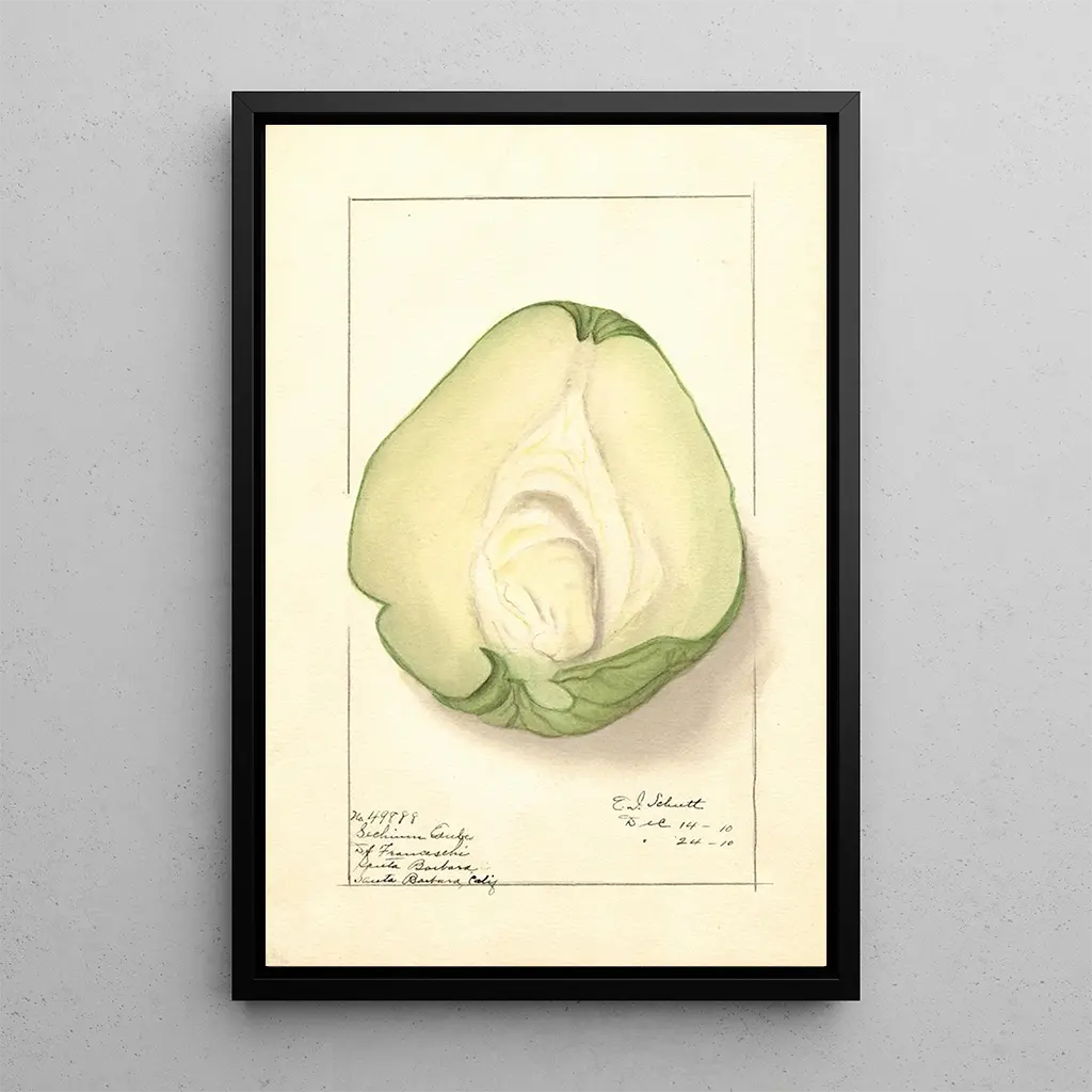 Sechium edule -taidegrafiikka Ellen Isham Schuttilta vangitsee hienovaraisesti trooppisen kasvin olemuksen. Eloisat vihreän sävyt sekoittuvat keltaisen ja ruskean vivahteisiin, luoden elävän ja lämpimän ilmapiirin. Vesiväritekniikka antaa taiteilijalle mahdollisuuden leikkiä läpinäkyvyydellä ja valolla, tarjoten syvyyttä, joka kutsuu tutkimaan. Jokainen yksityiskohta, hienovaraisista lehdistä kypsyviin hedelmiin, kertoo tarkasta luonnon havainnoinnista ja vie katsojan vehreään puutarhaan, jossa jokainen elementti kertoo tarinan.