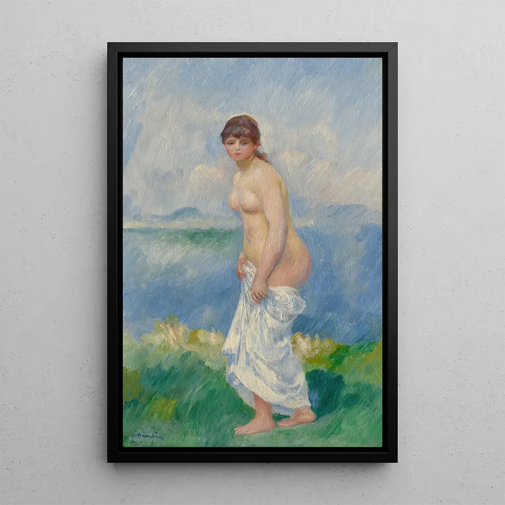 Tässä ikonisessa teoksessa Pierre-Auguste Renoir vangitsee seisovan uima-allasnaisen eleganssin ja sensuellisuuden, ympäröitynä pehmeällä ja lämpimällä valolla. Pastellivärit kietoutuvat harmonisesti yhteen, luoden rauhan ja intiimiyden tunnelman. Renoirin impressionistinen tekniikka ilmenee sulavina ja eloisina siveltimenvedoina, jotka herättävät eloon mallin herkän ihon. Tämä taidegrafiikka herättää raikkauden tunteen, ikään kuin voisi melkein tuntea veden iholla, samalla juhlistaen luonnollista kauneutta ja naisellisuutta.