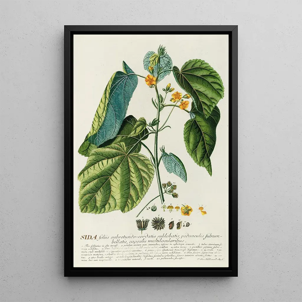 Sida-taidegrafiikka, jonka on luonut Georg Dionysius Ehret, vie meidät värien ja tekstuurien kiehtovaan maailmaan. Tämä taidegrafiikka korostaa Sida-kasvia, joka tunnetaan herkistä kukistaan ja eloisista lehdistään. Keltaisen ja vihreän sävyt kietoutuvat harmonisesti yhteen, luoden sekä rauhoittavan että dynaamisen ilmapiirin. Ehretin tekniikka, joka yhdistää tarkkuuden ja herkkyyden, mahdollistaa lehtien keveyden ja varren vahvuuden kokemisen. Tämä teos on todellinen luonnon ylistys, kutsuen tarkkailemaan ja ihastumaan.