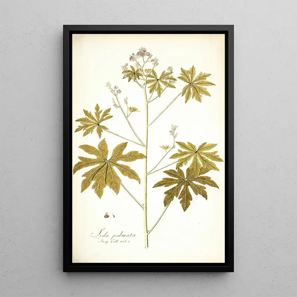 Taidegrafiikka Sida palmata, Nikolaus Joseph Freiherr von Jacquinin teos, kuljettaa meidät maailmaan, jossa luonto ilmaisee itseään loistokkaasti. Tämä taulu, joka on täynnä yksityiskohtia, esittelee laajalehtisen kasvin ja värikkäät kukat, vangiten biodiversiteetin olemuksen. Jacquinin käyttämä kaiverrustekniikka mahdollistaa muotojen ja tekstuurien monimutkaisuuden kunnianosoituksen, luoden sekä elävän että rauhallisen ilmapiirin. Jokainen teoksen elementti vaikuttaa energiseltä, kutsuen katsojan arvostamaan kasvikunnan kauneutta.