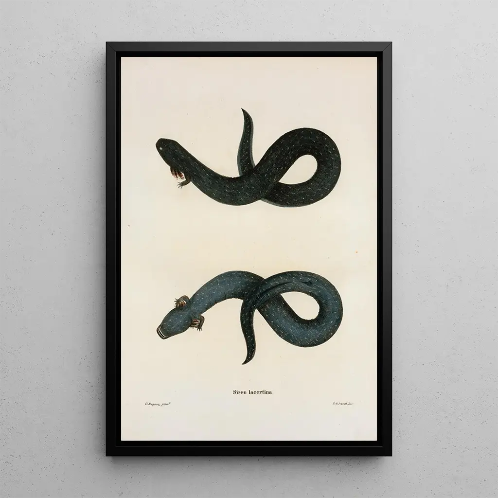 La taidegrafiikka de la Sirène lacertine de John Edwards Holbrook évoque un monde où la nature et le mythe se rencontrent. Cette œuvre captivante présente une créature hybride, mi-humaine, mi-reptilienne, dont les écailles scintillent sous une lumière douce. Les couleurs vives et les détails minutieux de la composition plongent le spectateur dans un univers onirique. La technique de l’artiste, mêlant aquarelle et dessin, crée une atmosphère à la fois mystérieuse et séduisante, invitant à l'exploration des profondeurs de l'imaginaire.