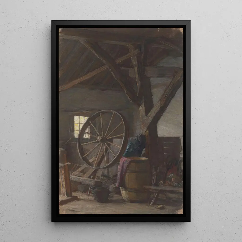 Maalausreproduktionen "Maalaistalon sisätila" tarjoaa kiehtovan katsauksen 1800-luvun maaseudun elämään. Pehmeät ja luonnolliset sävyt, beigestä vihreisiin, luovat lämpimän ja kutsuvan tunnelman. Kompositio, joka keskittyy arkipäivän esineisiin kuten maataloustarvikkeisiin ja eläimiin, heijastaa koskettavaa yksinkertaisuutta ja aitoutta. Veth onnistuu vangitsemaan paitsi navetan fyysisen tilan myös maalaistalon hengen, kutsuen katsojan pohtimaan usein unohdettua maailmaa.