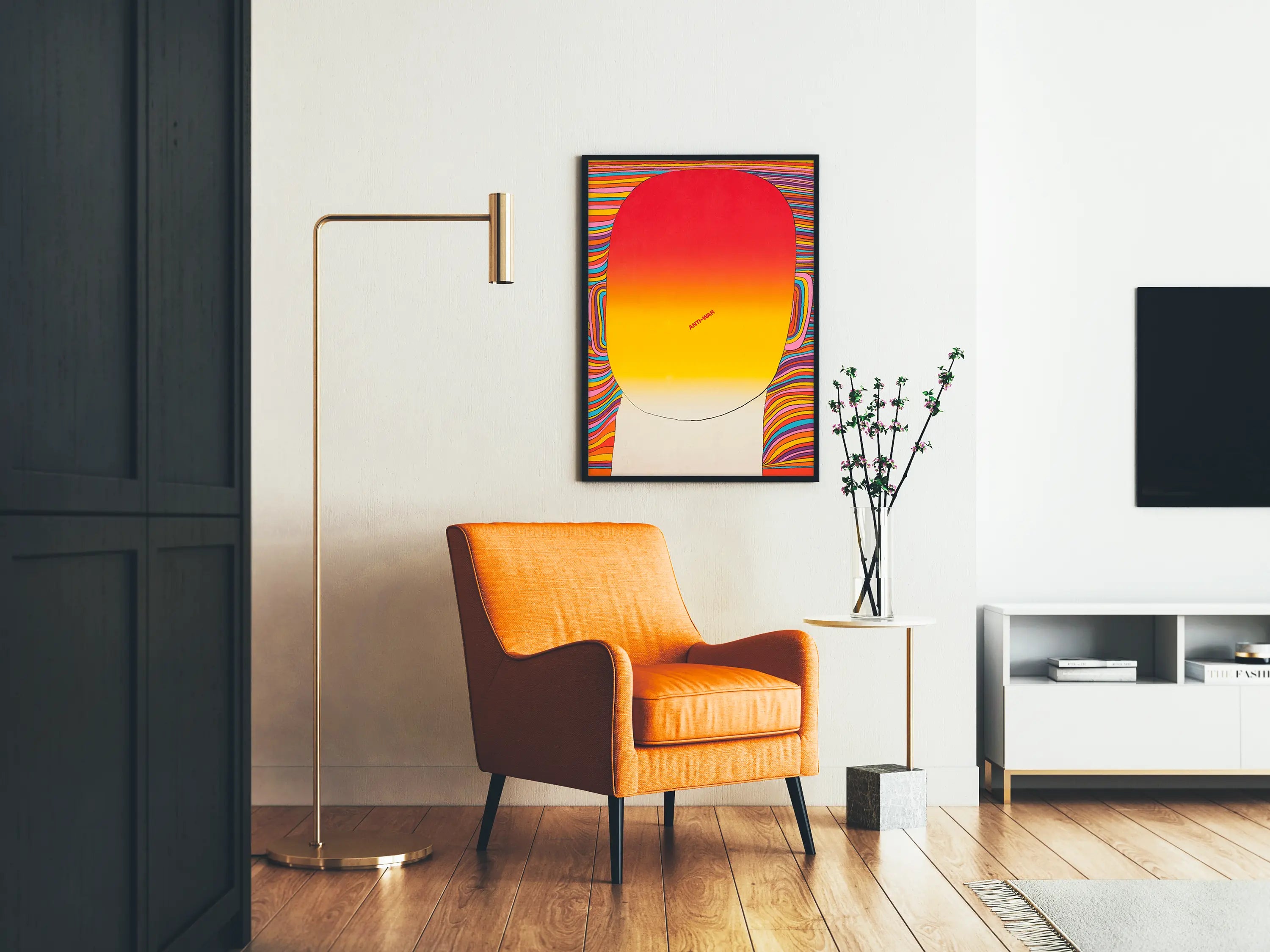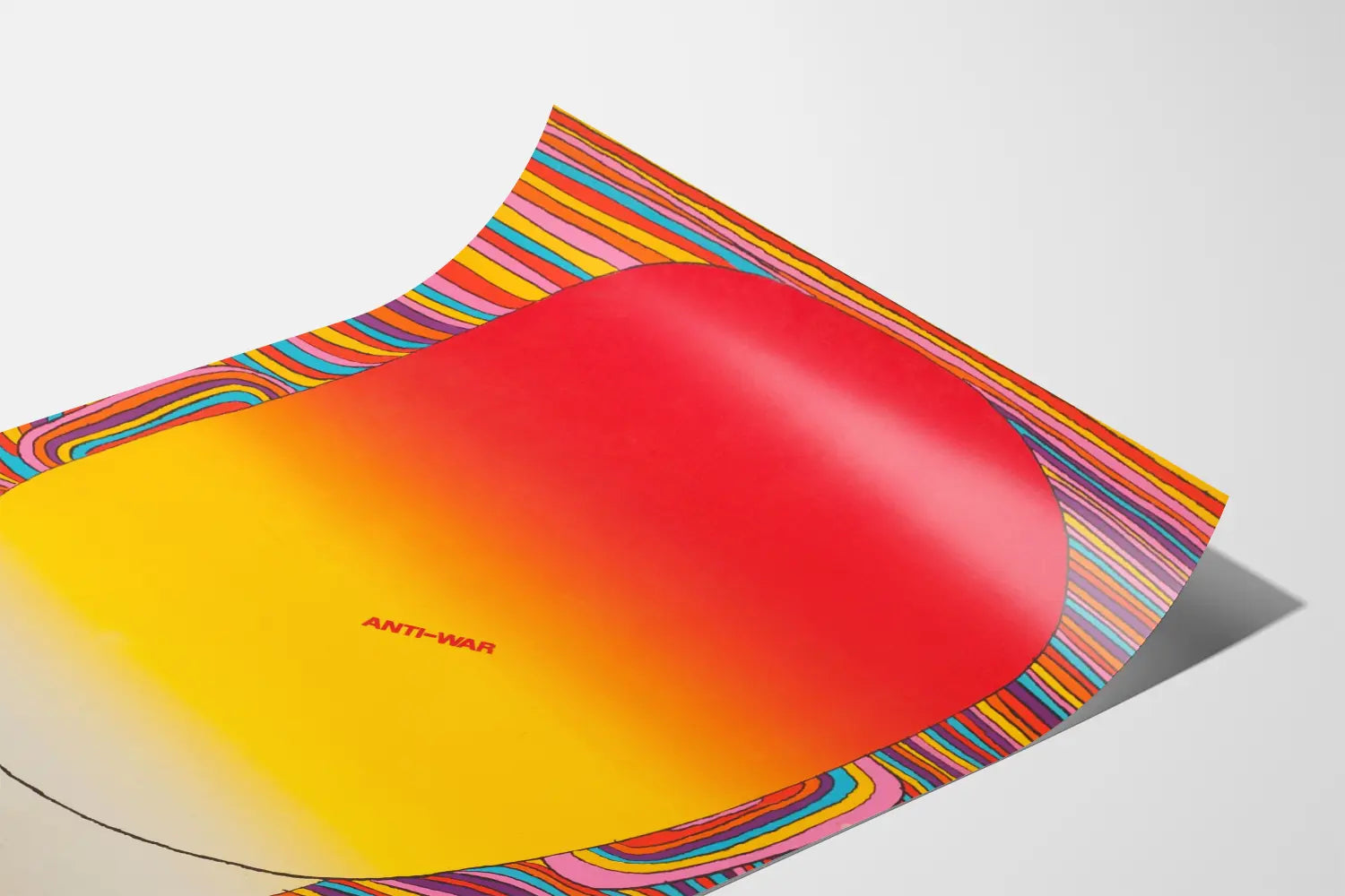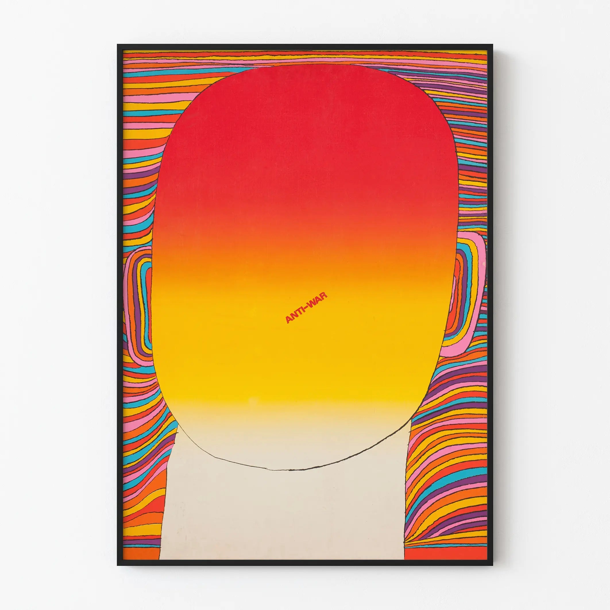 Tämä seinäjuliste tarjoaa abstraktin muotoilun lämpimissä väreissä, jotka vangitsevat välittömästi katseen. Suuren, punaisesta kirkkaaseen keltaiseen liukuvärjätyn ovaalin hallitsema teos kiinnittää huomion eloisalla kontrastillaan ja yksinkertaisella mutta tehokkaalla koostumuksellaan. Ovaalin keskellä painettu "ANTI-WAR" -sana punaisena lisää tähän seinäkoristeeseen sitoutuneen ulottuvuuden, korostaen selkeää rauhanviestiä tyylikkäässä graafisessa muodossa.