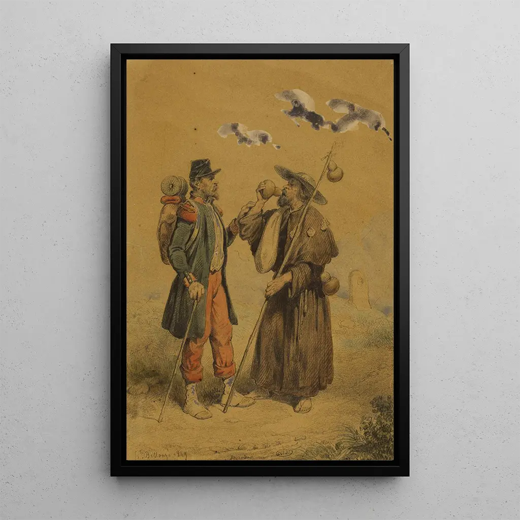 Myydään taidegrafiikka "Soldat donnant à boire à un pèlerin" -taidemaalauksesta, joka esittää myötätunnon ja inhimillisyyden hetken Hippolyte Bellangé'n teoksessa. Tämä yksityiskohtainen kohtaus korostaa univormuun pukeutunutta sotilasta, joka tarjoaa vettä väsyneelle pyhiinvaeltajalle. Lämmintä ja maanläheistä väriä käyttävät sävyt luovat lämpimän ja solidaarisen tunnelman, kun taas Bellangé'n tekniikka, joka yhdistää realismia ja romantiikkaa, herättää tämän emotionaalisen vuorovaikutuksen eloon. Jokainen teoksen elementti, ilmeistä asentoihin, rakentaa voimakkaan visuaalisen kertomuksen, joka koskettaa sydäntä.