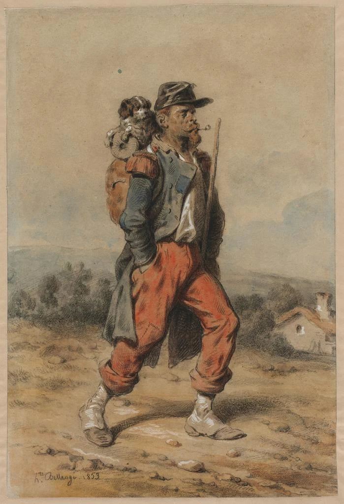 1800-luvulla aktiivisesti toiminut Hippolyte Bellangé tunnetaan teoksistaan, jotka kuvaavat sotilaselämää suurella tarkkuudella. Romantiikan vaikutuksesta hän on osannut vangita rohkeuden ja sankaruuden hetkiä, samalla korostaen aiheidensa inhimillistä ulottuvuutta. Hänen taulunsa, jotka usein saavat inspiraationsa historiallisista tapahtumista, kertovat ajasta, jolloin sota oli läsnä kaikkialla. Bellangé on saavuttanut mainetta kyvyllään ikuistaa taistelukohtauksia, mutta myös hellyyden hetkiä, kuten tämä, jossa ihmisen ja eläimen välinen side korostuu.