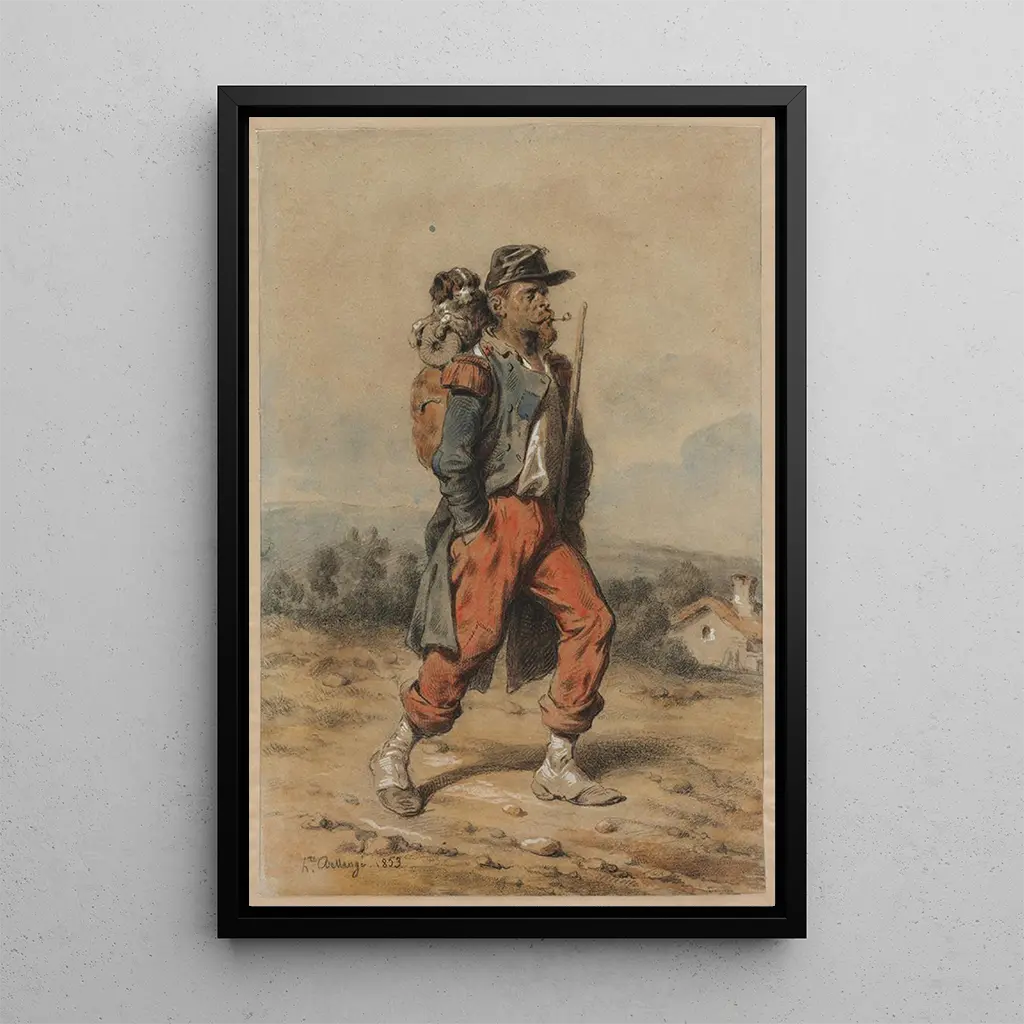 Tässä vaikuttavassa teoksessa Hippolyte Bellangé'n taidegrafiikka "Soldat avec chien" vangitsee rohkeuden ja uskollisuuden ytimen. Kompositio esittää univormuun pukeutuneen sotilaan, jonka päättäväinen katse on suunnattu horisonttiin, kun taas hänen jalkojensa juuressa on koira, jonka silmät ovat täynnä omistautumista. Lämmintä ja maamaisia sävyjä, yhdistettynä valon pilkahduksiin, luovat sekä nostalgiaa että sankarillisuutta huokuvan tunnelman. Bellangé'n tekniikka, joka yhdistää realismia ja romantiikkaa, herättää tämän kohtauksen eloon, herättäen syviä tunteita ja vahvan yhteyden ihmisen ja hänen kumppaninsa välillä.