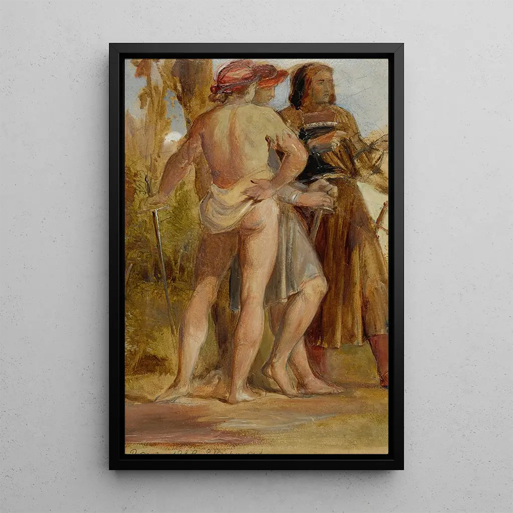 L'œuvre "Étude de soldats" de George Richmond est une représentation poignante de la bravoure et de l'héroïsme. À travers des coups de pinceau délicats, Richmond capture l'essence même de la vie militaire, mettant en avant des soldats en pleine action. Les teintes terreuses et les nuances de gris créent une atmosphère à la fois dramatique et réaliste, tandis que la lumière joue sur les uniformes, accentuant les détails des visages et des postures. Cette toile, par sa composition harmonieuse, invite le spectateur à plonger dans un moment de tension et de détermination, révélant les émotions qui animent ces figures emblématiques.