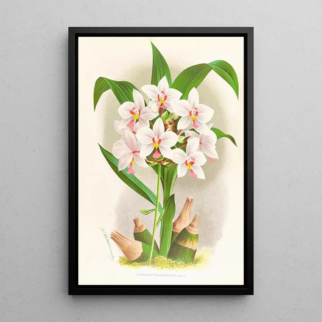 Jean Jules Lindenin taidegrafiikka Spathoglottis Augustorum on juhla trooppiselle kasvistolle, jossa jokainen terälehti vaikuttaa kertovan tarinan. Tämä teos, täynnä räikeitä värejä, korostaa keltaisten ja violetin sävyjen rikkautta, luoden vaikuttavan kontrastin, joka vangitsee heti katseen. Lindenin tekniikka, joka yhdistää tarkkuuden ja sulavuuden, herättää nämä eksoottiset kukat eloon, luoden tunnelman rauhasta ja luonnonkauneudesta. Herkästi sävytetty tausta antaa kukkien erottua, vahvistaen syvyyden ja ulottuvuuden vaikutelmaa, ikään kuin voisi melkein tuntea niiden tuoksun.