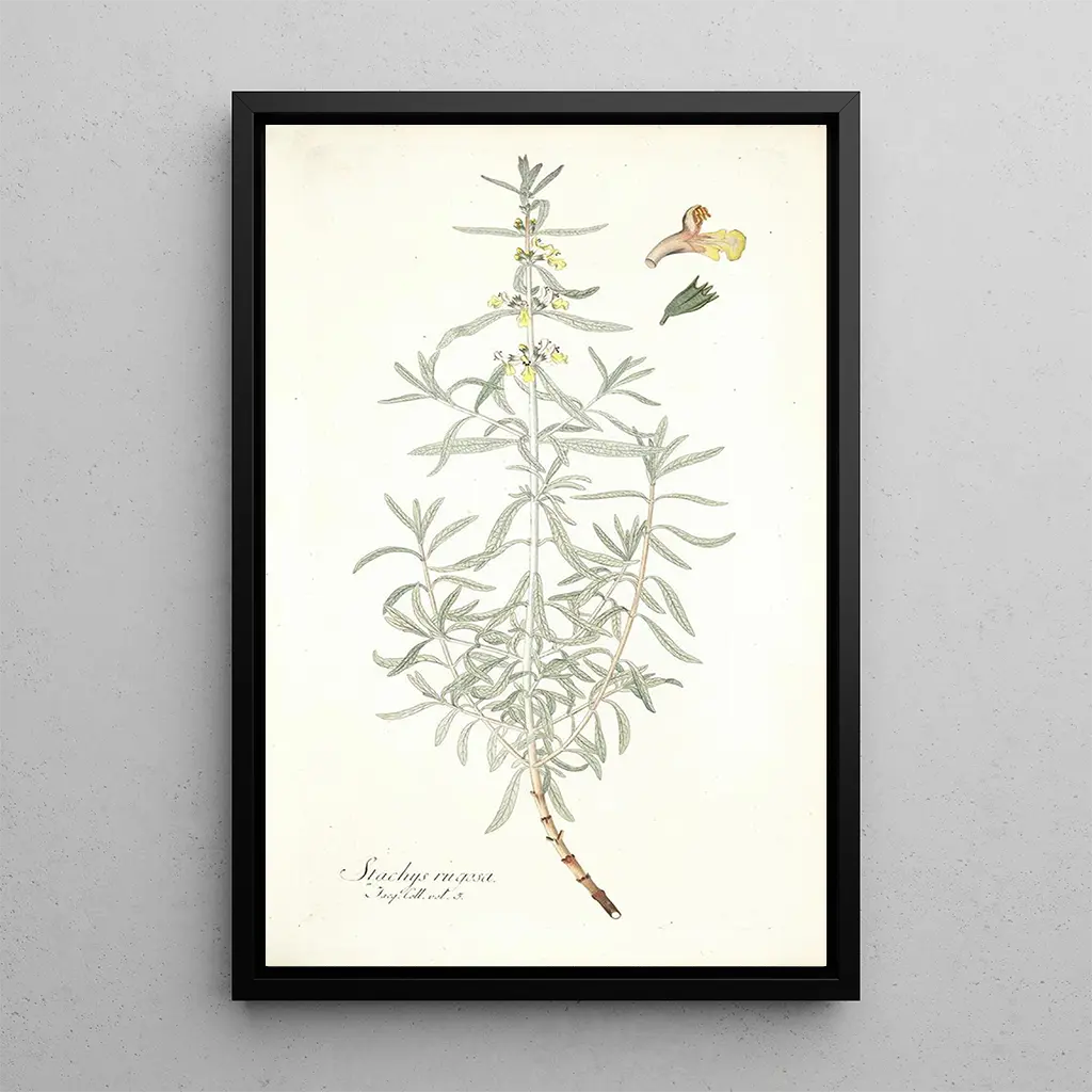 Nikolaus Joseph Freiherr von Jacquinin taidegrafiikka Stachys rugosa -teoksesta johdattaa meidät kiehtovaan kasvitieteelliseen maailmaan. Tämä taidegrafiikka korostaa kasvin ainutlaatuista kauneutta, yksityiskohtien kautta, jotka paljastavat sen lehtien sametinpehmeän tekstuurin ja kukkien hienostuneisuuden. Väriskaala, joka ulottuu pehmeästä vihreästä hienovaraisen violettiin, luo rauhoittavan ja mietiskelevän ilmapiirin. Jacquinin käyttämä vesiväritekniikka mahdollistaa hienovaraiset sävyt, jotka kunnioittavat luonnon rikkautta. Jokainen sivellinvedos tuntuu vangitsevan katoavan hetken, kutsuen ihailemaan kasvikunnan loistoa.