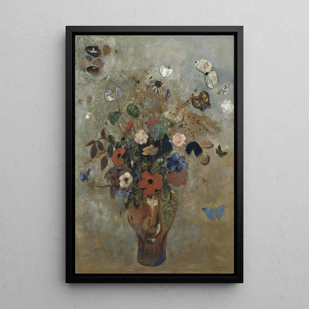 Odilon Redon, syntynyt 1840, on taiteilija, joka on onnistunut ylittämään aikansa konventiot tutkiakseen mielikuvituksen syvyyksiä. Symbolismin vaikutuksesta hän loi visuaalisen maailman, joka on täynnä fantastisia olentoja ja unenomaisia maisemia. Hänen luomisaikansa ulottuu useiden vuosikymmenien ajalle, jolloin hän kokeili erilaisia medioita, kuten litografiaa ja maalausta. Taidegrafiikka kukkien kanssa todistaa hänen kiinnostuksestaan luonnon ja kauneuden teemoihin, samalla paljastaen hänen kykynsä vangita voimakkaita tunteita hienovaraisilla koostumuksilla. Redon on jättänyt pysyvän perinnön, joka inspiroi monia taiteilijoita eri aikakausina.