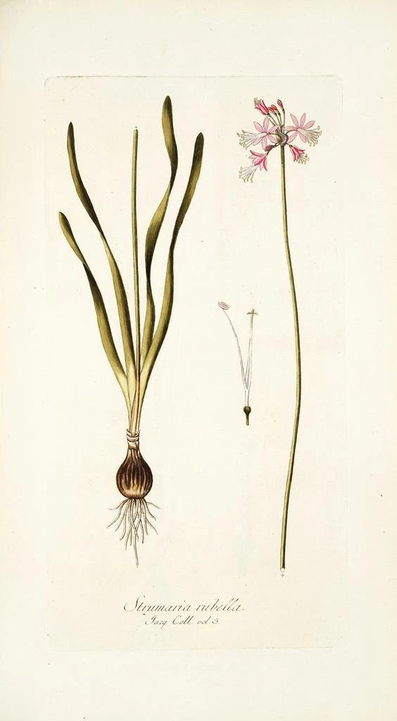 Nikolaus Joseph Freiherr von Jacquin, 1700-luvun kasvitieteilijä ja taiteilija, osasi yhdistää tieteen ja taiteen teoksissaan. Syntynyt vuonna 1727 Itävallassa, hänet vaikutti aikakauden valistusajattelun virtaukset, joissa luonnon havainnointi oli keskeisessä asemassa. Hänen matkansa Etelä-Amerikkaan ja Karibian alueelle mahdollistivat rikkaan ja monimuotoisen kasviston löytämisen, jonka hän myöhemmin kuvitti tarkasti. Jacquin tunnetaan panoksestaan kasvitieteeseen, mutta myös ainutlaatuisesta taiteellisesta tyylistään, joka yhdistää tieteellisen tarkkuuden ja esteettisen herkkyyden. Hänen teoksensa, kuten Strumaria rubella, todistavat luonnon merkityksestä hänen aikansa taiteessa.