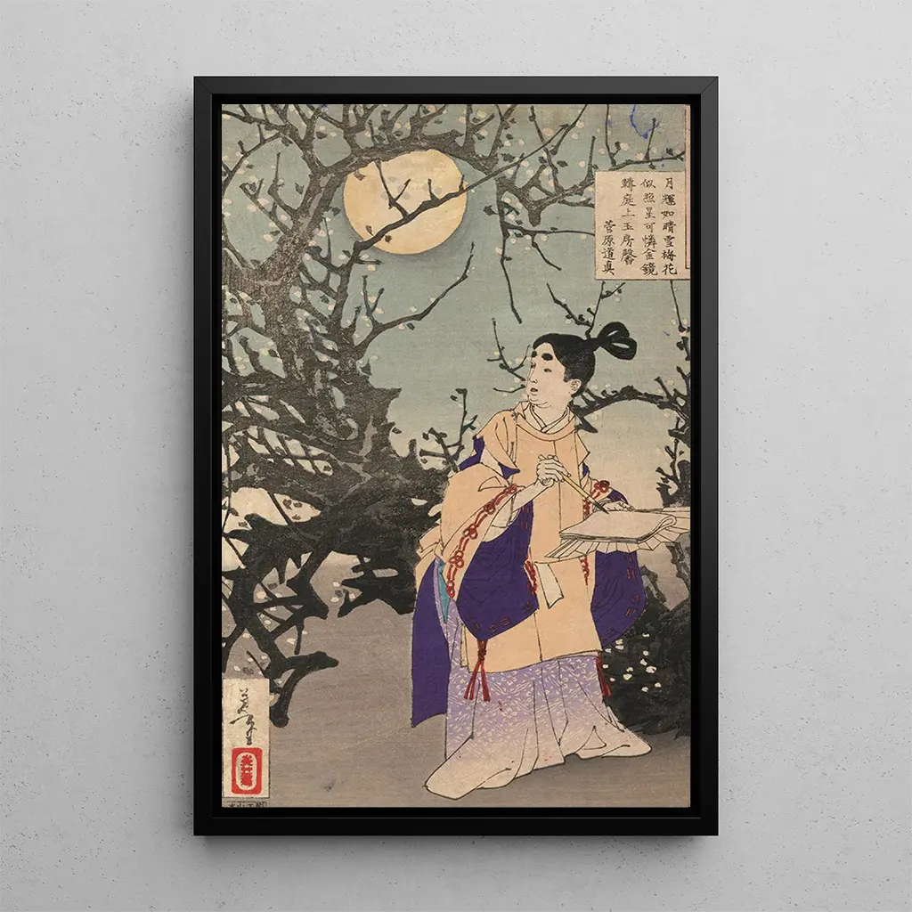 Sugawara no Michizane : kunniamaininta viisaudelle ja melankolialle Tässä ikonisessa teoksessa Tsukioka Yoshitoshi esittelee Sugawara no Michizanen, Japanissa arvostetun historiallis-hahmon. Maalaus kuvaa henkilöä mietiskelevässä asennossa, ympäröitynä viisauden symboleilla, kuten kurjien sulilla. Pehmeät värit ja hienovaraiset sävyt luovat rauhallisen, lähes pohdiskelevan tunnelman. Ukiyo-e-tekniikka mahdollistaa tunteiden syvyyden vangitsemisen, tehden tästä taidegrafiikan reproduktiosta Sugawara no Michizane -teoksen koskettavan ja inspiroivan, kutsuen katsojan uppoutumaan tämän legendaarisen hahmon historiaan. Tsukioka Yoshitoshi : japanilaisen puupiirroksen mestari Tsukioka Yoshitoshi, syntynyt vuonna 1839, tunnetaan yhtenä viimeisistä suurista ukiyo-e-mestareista, japanilaisessa puupiirrostyylissä, joka saavutti huippunsa 1600- ja 1800-luvuilla. Hänen uransa oli monien vaikutteiden muovaama, ulottuen muinaisiin perinteisiin ja Meiji-ajan yhteiskunnallisiin muutoksiin. Yoshitoshi osasi yhdistää populaarikulttuurin elementtejä säilyttäen samalla klassisten teemojen rikkauden. Hänen teoksensa, usein täynnä tunnetta ja symboliikkaa, todistavat hänen ainutlaatuisesta taidostaan ja merkityksestään japanilaisen taiteen historiassa, kuten tämä Sugawara no Michizane -taidegrafiikan reproduktio osoittaa. Monipuolinen koristeellinen hankinta Sugawara no Michizane -taidegrafiikan reproduktio on koristeellinen kappale, joka tuo kotiisi aitouden ja kulttuurin tuntua. Olipa kyseessä olohuone, toimisto tai makuuhuone, se kiinnittää huomion ja rikastuttaa sisustustasi. Tulostuksen laatu ja alkuperäisteoksen yksityiskohtien tarkkuus takaavat hienostuneen estetiikan. Valitsemalla tämän kankaan sijoitat kotiisi teoksen, joka ei ainoastaan kaunista tilaa, vaan myös herättää syvällisen historian ja japanilaisen kulttuurin matkalle jokaisella katselukerralla.