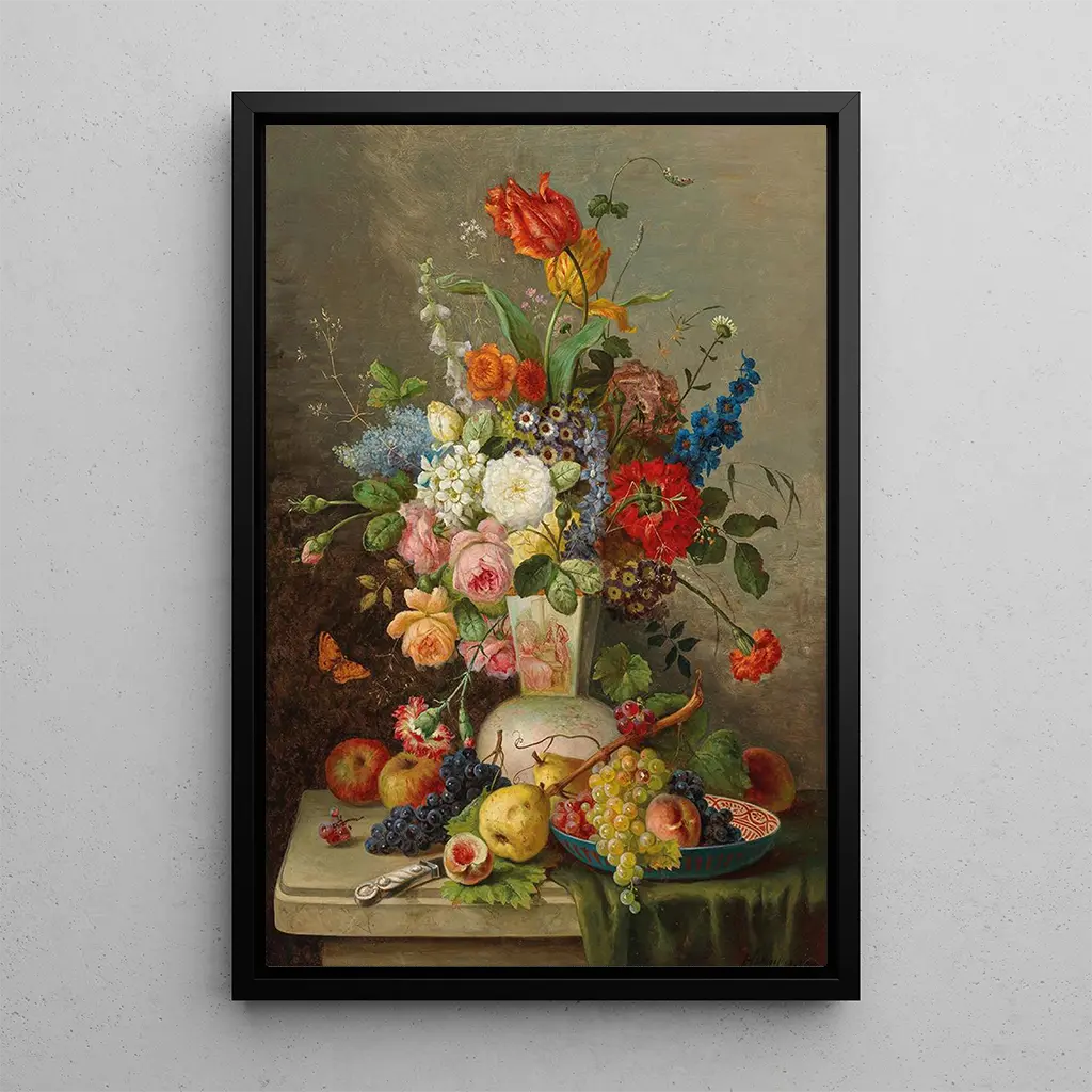Franz Hohenberger, 1800-luvulla aktiivinen taiteilija, tunnetaan still life -taidegrafiikoistaan, jotka vangitsevat ohikiitävän elämän loiston. Hän sai vaikutteita flaamilaisilta mestareilta ja kehitti tyylin, joka yhdistää tarkkuuden ja herkkyyden. Hänen työnsä erottuu huolellisesta yksityiskohtien huomioimisesta ja eloisasta väripaletistaan, jotka antavat uutta elämää klassisille koostumuksille. Suuri kukkakimppu ja hedelmiä kivilaadulla on täydellinen esimerkki hänen taidostaan muuttaa tavallisia elementtejä upeiksi taideteoksiksi, mikä todistaa hänen lahjakkuutensa ja sitoutumisensa luonnon kauneuteen.