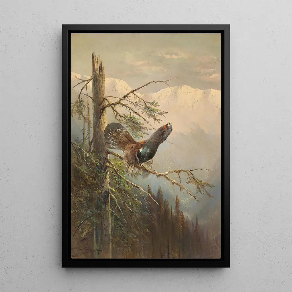 Dans cette œuvre captivante, Moritz Müller nous plonge au cœur d'une scène vivante où le grand tétras, majestueux oiseau des forêts, se livre à une parade nuptiale. Les couleurs vibrantes de ses plumes, allant du brun terreux aux éclats irisés, créent un contraste saisissant avec le vert luxuriant de son environnement. La technique de Müller, alliant précision et sensibilité, rend palpable l'atmosphère de ce moment éphémère. Chaque détail, des plumes délicatement rendues aux mouvements gracieux de l'oiseau, invite le spectateur à admirer la beauté de la nature et à ressentir l'énergie de cette danse aviaire.