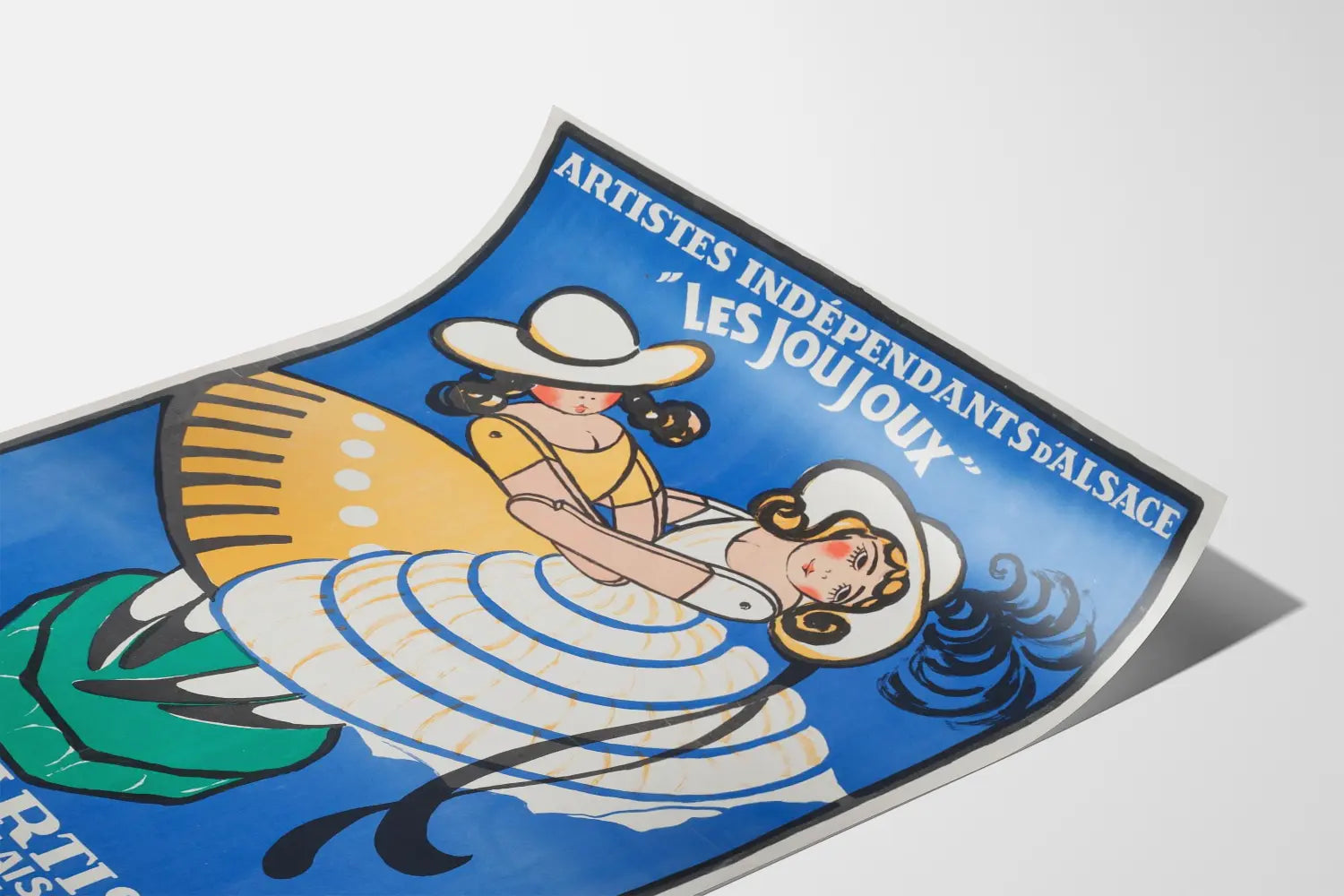 Tämä vintagejuliste nimeltä « Bal des Artistes Les Joujoux » kuvaa värikästä ja juhlavaa kohtausta, täydellistä ainutlaatuisen ja aitoon seinäkoristukseen. Se esittelee kaksi tyyliteltyä tanssijaa, jotka pukeutuvat kirkkaisiin pukuisiin – toinen keltaiseen ja toinen valkoiseen, molemmat elegantisti hatuilla varustettuina. Syvän sininen tausta luo vaikuttavan kontrastin kuvattuihin hahmoihin ja lisää kokonaisuuteen energiaa.