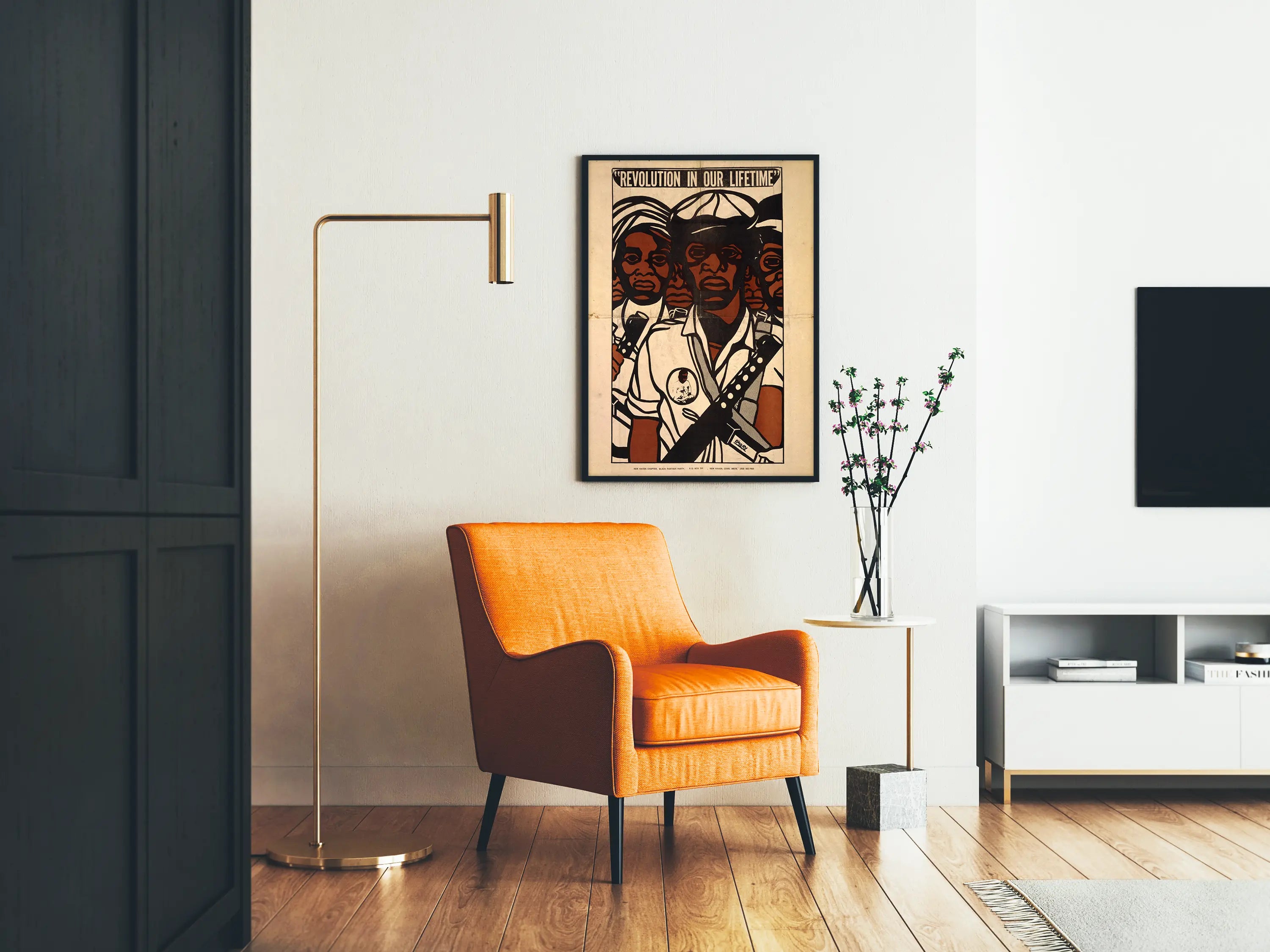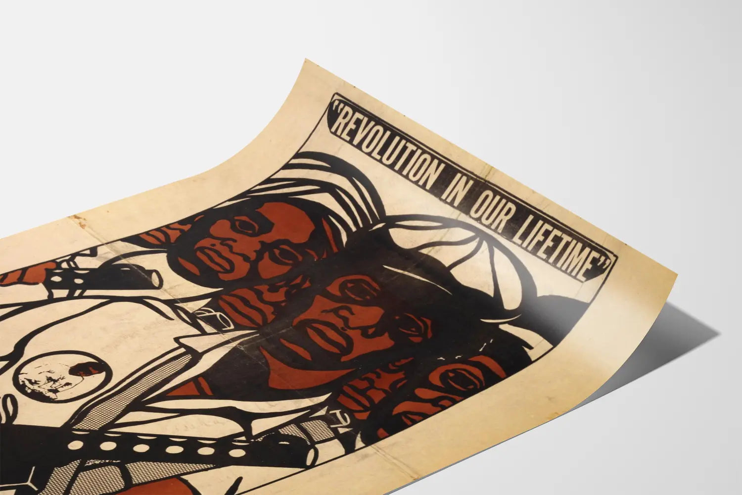 Tämä graafisesti vahva juliste esittää voimakkaan mustan ja ruskean kuvituksen beigen taustalla, nimeltään «Revoluutio elinaikanamme». Se kuvaa kolmea päättäväistä ihmishahmoa, jotka näkyvät etualalla, kantavat ristikkäin asetettuja aseita rintakehällään ja pukeutuneet yksinkertaisesti mutta symbolisesti. Tämä raaka ja sitoutunut seinäkoriste heijastaa taistelun ja poliittisen mobilisaation aikaa, täydellisesti kuvastaen kapinan ja vaatimuksen tunnelmaa. Tämä 60-70-lukujen tyypillinen graafinen juliste erottuu vahvalla koostumuksellaan ja vaikuttavalla viestillään, tehden siitä paitsi kiehtovan sisustuselementin myös voimakkaan visuaalisen kertomuksen kantajan. Täydellinen sisäseinien koristeluun, tämä juliste toimii kulttuurisen ja historiallisen ilmaisun välineenä, ihanteellinen sitoutuneen taiteen ystäville tai tiloihin, jotka haluavat herättää oikeuden, vastarinnan ja yhteiskunnallisen muutoksen teemoja. Piirroksen tyyli, sekä yksinkertainen että dynaaminen, luo draamaattisen intensiteetin, joka heti vangitsee katseen ja kutsuu pohdintaan. Rajoitettu väripaletti korostaa kontrastia ja tuo esiin kasvonpiirteet sekä kuvan keskeiset elementit, korostaen viestin voimaa. Sisustamalla huoneen tällä julisteella, tuot sisätiloihisi vintage-henkeä ja aktivistista tunnelmaa, samalla arvostaen ikonisymboliikkaa, joka on universaali. Tämä juliste on ihanteellinen olohuoneeseen, toimistoon tai henkilökohtaiseen galleriaan, jossa seinäkoristeen tarkoitus on kantaa merkitystä ja herättää tunteita. Yhteenvetona, tämä vallankumouksellinen Black Panther Party -juliste on erinomainen valinta kaikille sitoutuneen seinäkoristeen kokoelmille, muistuttaen merkittävästä historiallisesta ajasta ja edistäen keskustelua kansalaisoikeuksista ja yhteiskunnallisesta taistelusta.