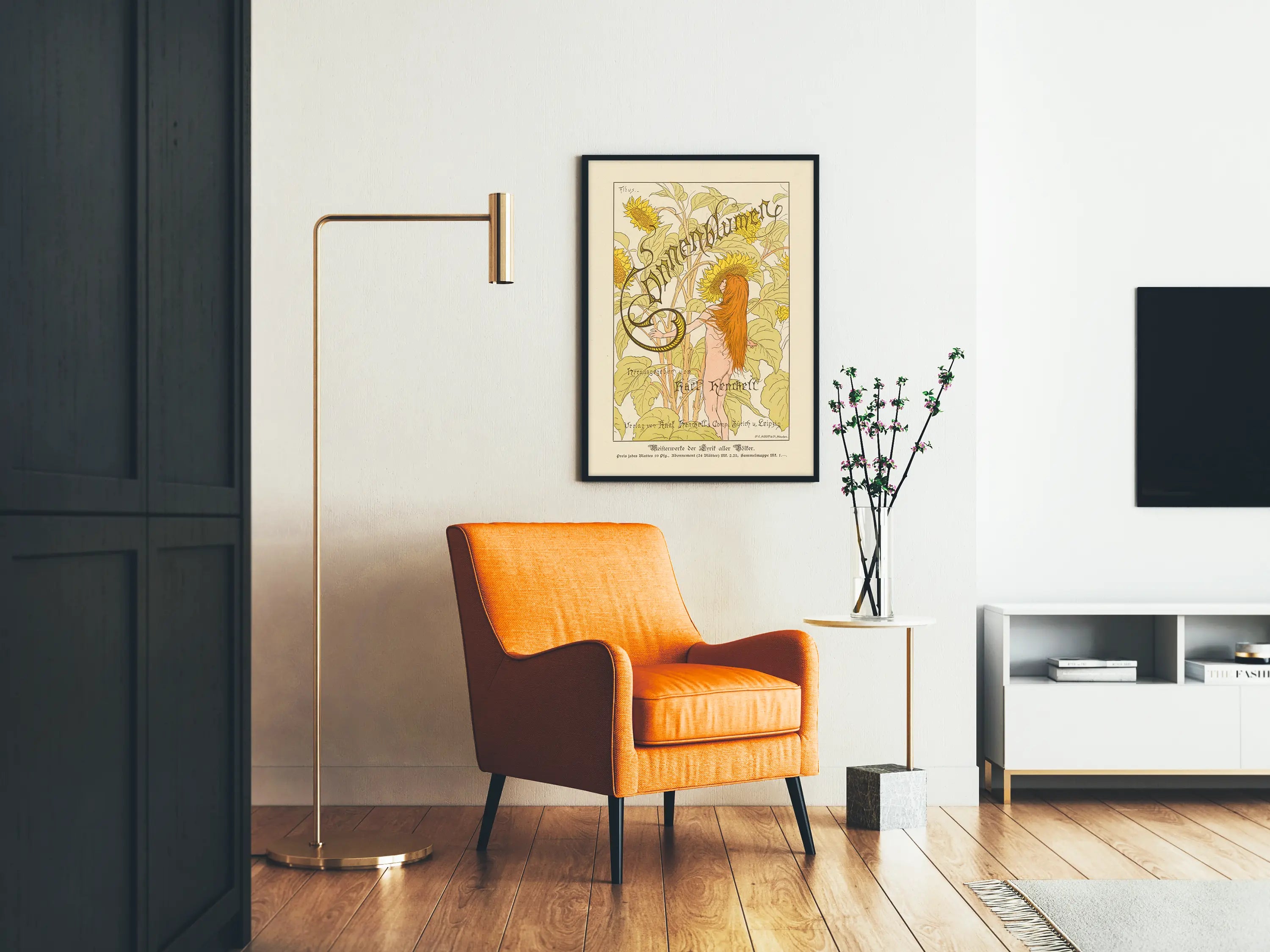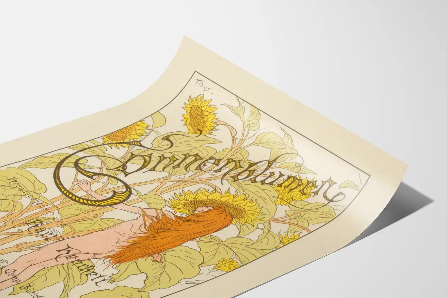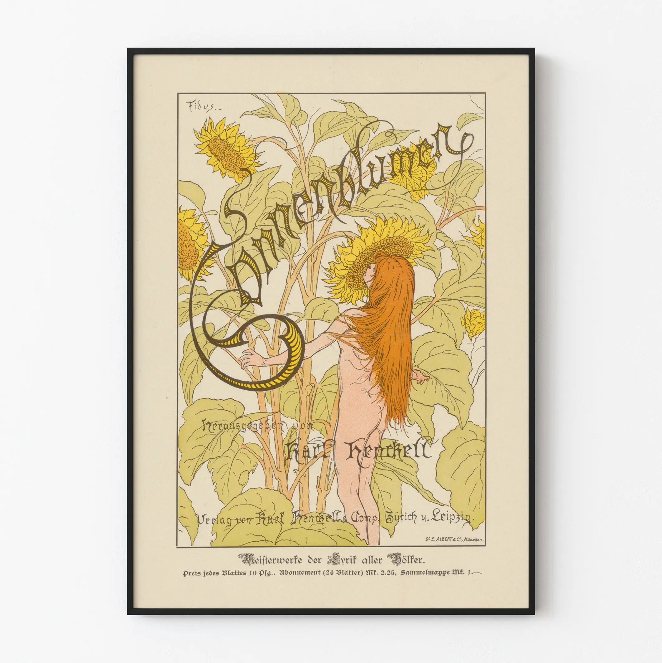 Art Nouveau -juliste auringonkukista ja alastomasta naisesta Fiduksen teoksesta