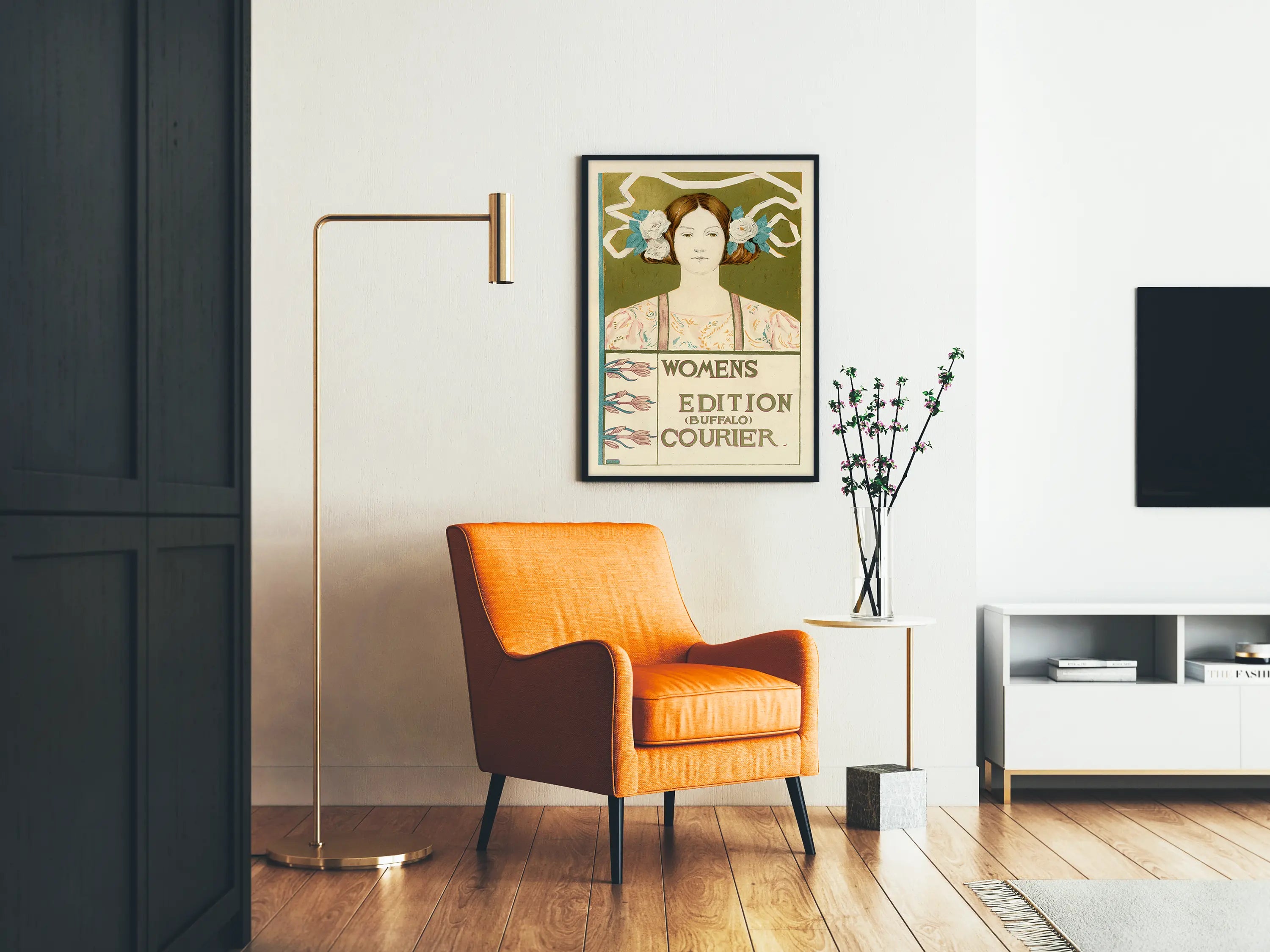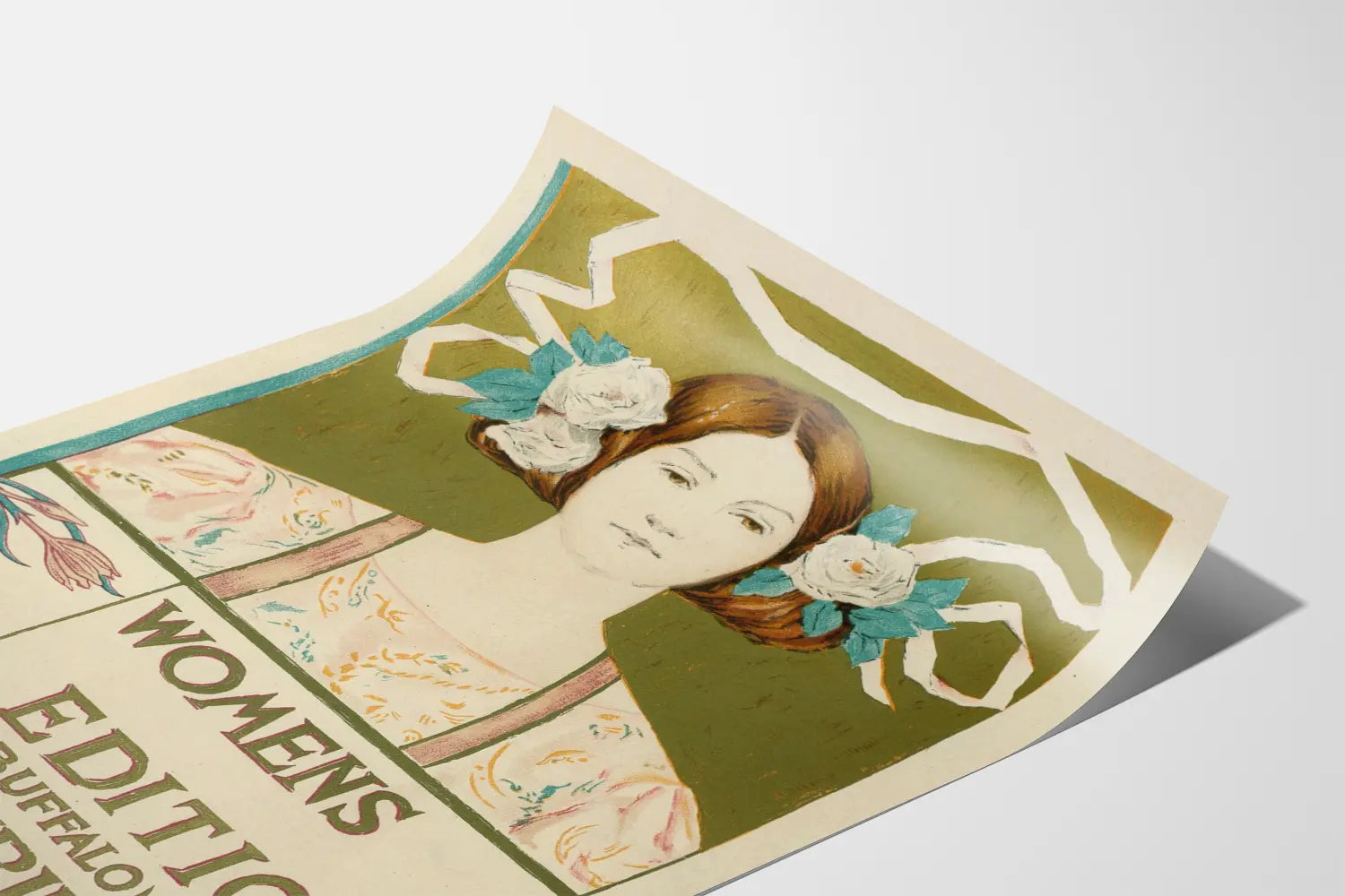 Tämä Art Nouveau -tyylinen vintage juliste esittää elegantin naisfiguurin ja tekstin "Womens Edition (Buffalo) Courier". Graafinen koostumus on tyypillinen Art Nouveau -tyylille, sisältäen sulavia linjoja, kukkakehysten kehyksen ja pehmeitä värejä kuten oliivinvihreää, vaaleanpunaista, sinistä ja beigeä. Keskellä oleva nainen, jonka päässä on valkoisia kukkia, edustaa hienostunutta taiteellista estetiikkaa, mikä tekee siitä ihanteellisen seinäkoristeen, joka korostaa 1900-luvun alun viehätystä. Tämä juliste, jossa on yksinkertainen suora kehys ja vasemmalla tyyliteltyjä kukkakuvioita, voi tuoda tilaan nostalgiaa ja hienostuneisuutta. Olipa kyseessä olohuone, makuuhuone tai toimisto, tämä juliste rikastuttaa tunnelmaa vintage-hengellä ja vahvalla graafisella suunnittelulla. Sen tasapainoinen koostumus ja Art Nouveau -tyylille tyypilliset taiteelliset yksityiskohdat tekevät siitä ainutlaatuisen seinäkoristeen, jonka voi kerätä tai antaa lahjaksi. Täydellinen retro-tyylien ja historian taiteen ystäville, tämä juliste lisää sisustukseesi naisellisen ja elegantin sävyn.