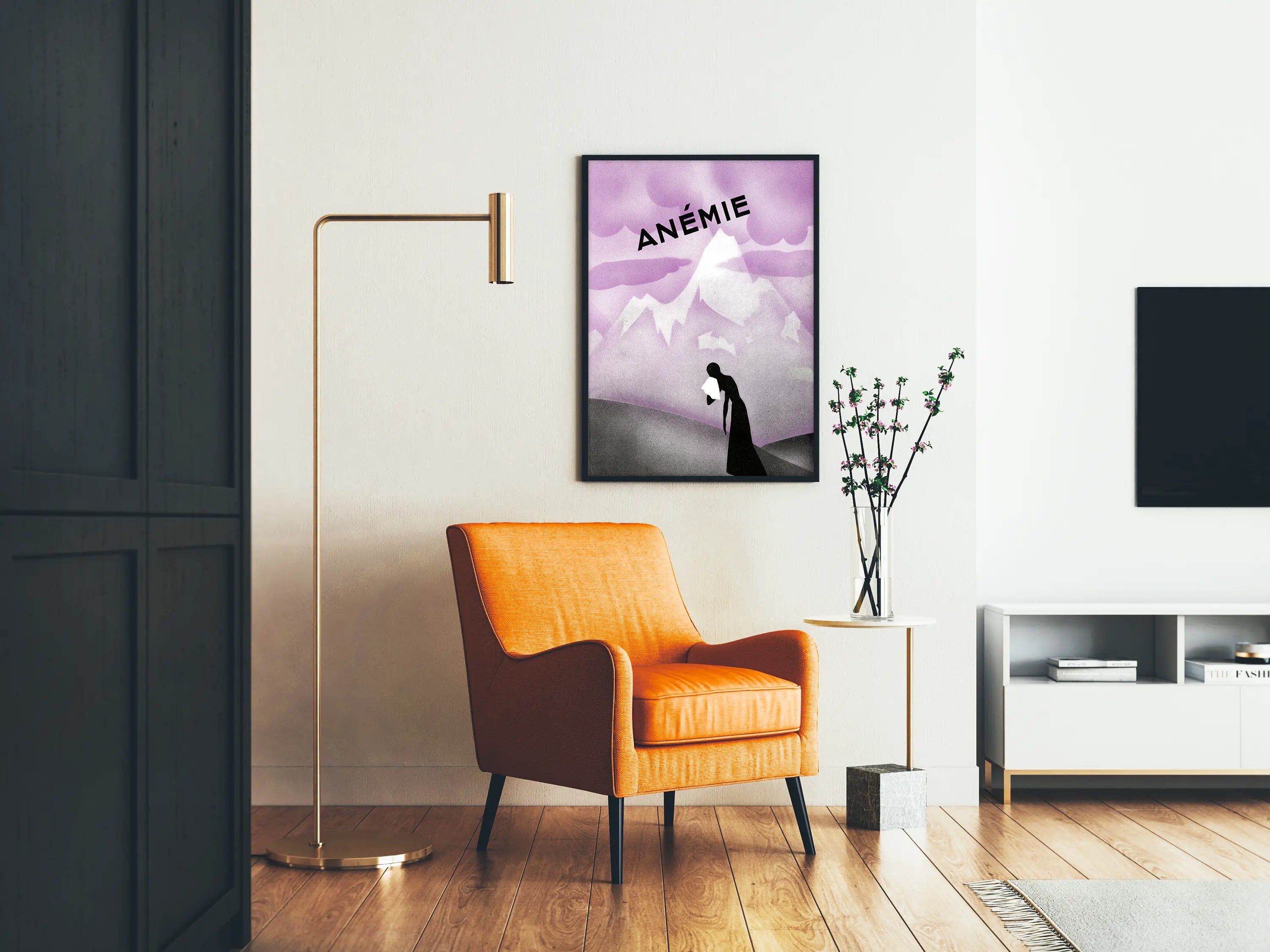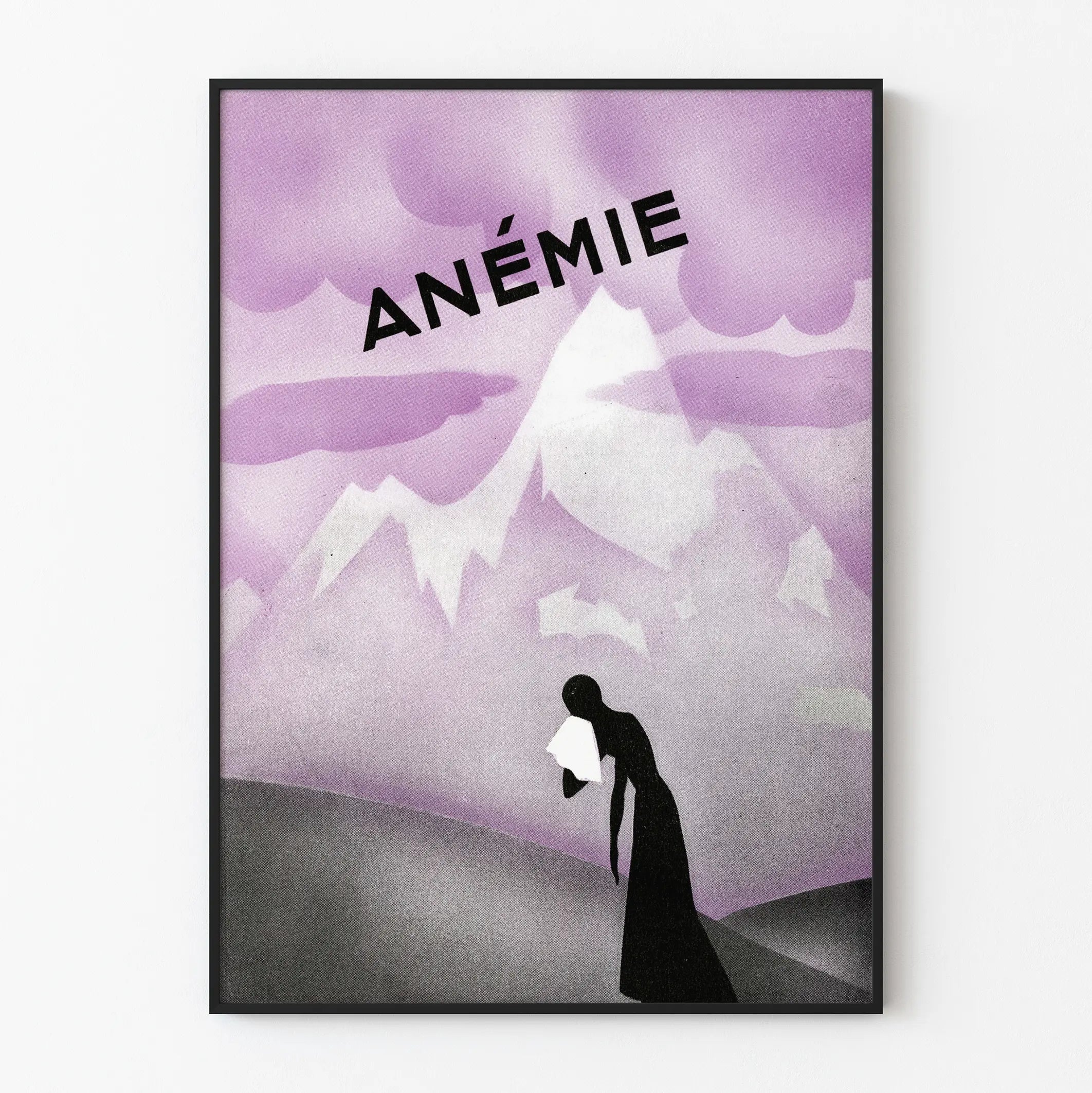 Tämä taiteellinen juliste tarjoaa tyylitellyn ja vaikuttavan esityksen anemia-aiheesta. Sen hallitsevat hienovaraiset, liukuvat violetin sävyt, ja taustalla näkyy minimalistinen vuoristomaisema, joka on piirretty hienovaraisin kontrastein vaalean laventelin ja tumman violetin välillä. Taivasta hallitsevat pyöreämuotoiset pilvet, jotka lisäävät kuvan raskasta ja melankolista tunnelmaa. Etualalla musta siluetti kumartuvasta naisesta, joka pitää valkoista nenäliinaa, symboloi heikkouden tai väsymyksen tilaa ja vahvistaa sairauden teemaa. Yläosassa oleva suurella kirjaimella ja mustalla kirjoitettu sana "ANEMIA" lisää teokseen informatiivisen ja suoran ulottuvuuden. Tämä vintage-plakaatti, sen yksinkertaisesta tyylistä ja korostetusta yksivärisestä väripaletistaan johtuen, on ainutlaatuinen seinäkoriste, joka sopii hillittyyn ja älykkääseen sisustukseen. Ihanteellinen kehystettäväksi ja esille asetettavaksi nykyaikaisessa sisätilassa tai lääketieteellisessä teemassa, se herättää sekä pohdintaa että uteliaisuutta symbolisen visuaalinsa ja graafisen koostumuksensa ansiosta. Teos, joka yhdistää taiteen ja viestin hienovaraisesti, sopii täydellisesti opetuksellisten ja koristeellisten julisteiden tai affisien kokoelmaan.