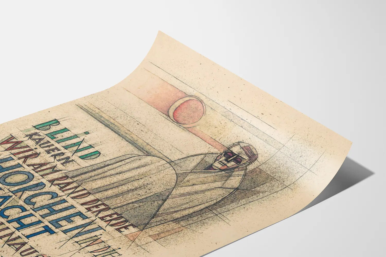 Tämä koristeellinen juliste nimeltä "Blind Kauern Wir Am Rand Der Erde" esittelee ainutlaatuisen graafisen estetiikan, jossa taitavasti yhdistyvät hienot viivat, geometriset muodot ja ilmeikäs typografia. Esittäen istuvan ihmisen siluetin, joka on kääritty päällystakkiin, teos luo pohdiskevan ja salaperäisen tunnelman. Värimaailma on hienovaraisesti sävytetty pastellisävyihin ja maanläheisiin sävyihin, ja siihen on lisätty punaisen, sinisen ja vihreän sävyjä, jotka korostavat tiettyjä tekstielementtejä. Tämä taiteellinen juliste ammentaa ilmeisesti moderneista ja kubistisista tyyleistä, tarjoten tasapainoisen koostumuksen, jossa kuva ja teksti sulautuvat harmonisesti. Julisteeseen sisällytetty saksankielinen lainaus lisää kirjallista ja runollista ulottuvuutta, vahvistaen sen vetovoimaa seinäkoristeena moderni- tai sisustussuunnitteluun. Tämä juliste on ihanteellinen seinän korostamiseen tuoden ripauksen hienostuneisuutta ja omaleimaisuutta ainutlaatuisen graafisen koostumuksensa ansiosta. Täydellinen olohuoneeseen, toimistoon tai galleriaan, se kutsuu pohdintaan ja luo rauhoittavan ilmapiirin. Tämä yksinkertainen mutta ilmeikäs koristejuliste soveltuu monenlaisiin sisustusmalleihin, minimalistisesta eklektiseen, tarjoten samalla vaikuttavan visuaalisen tasapainon. Esteettinen teos, joka erottuu selkeällä graafisella tyylillään ja hienovaraisesti tasapainotetulla värimaailmallaan.