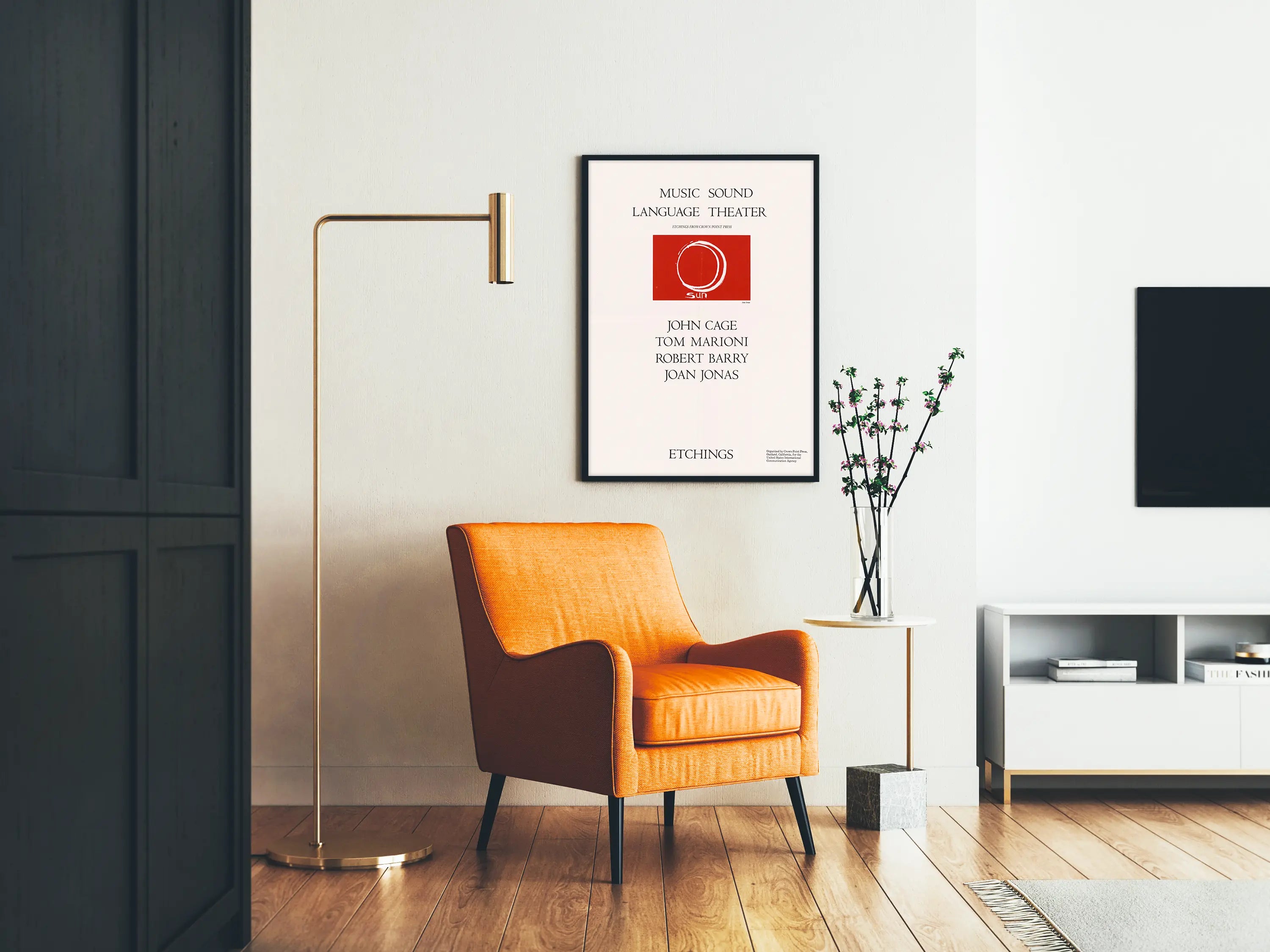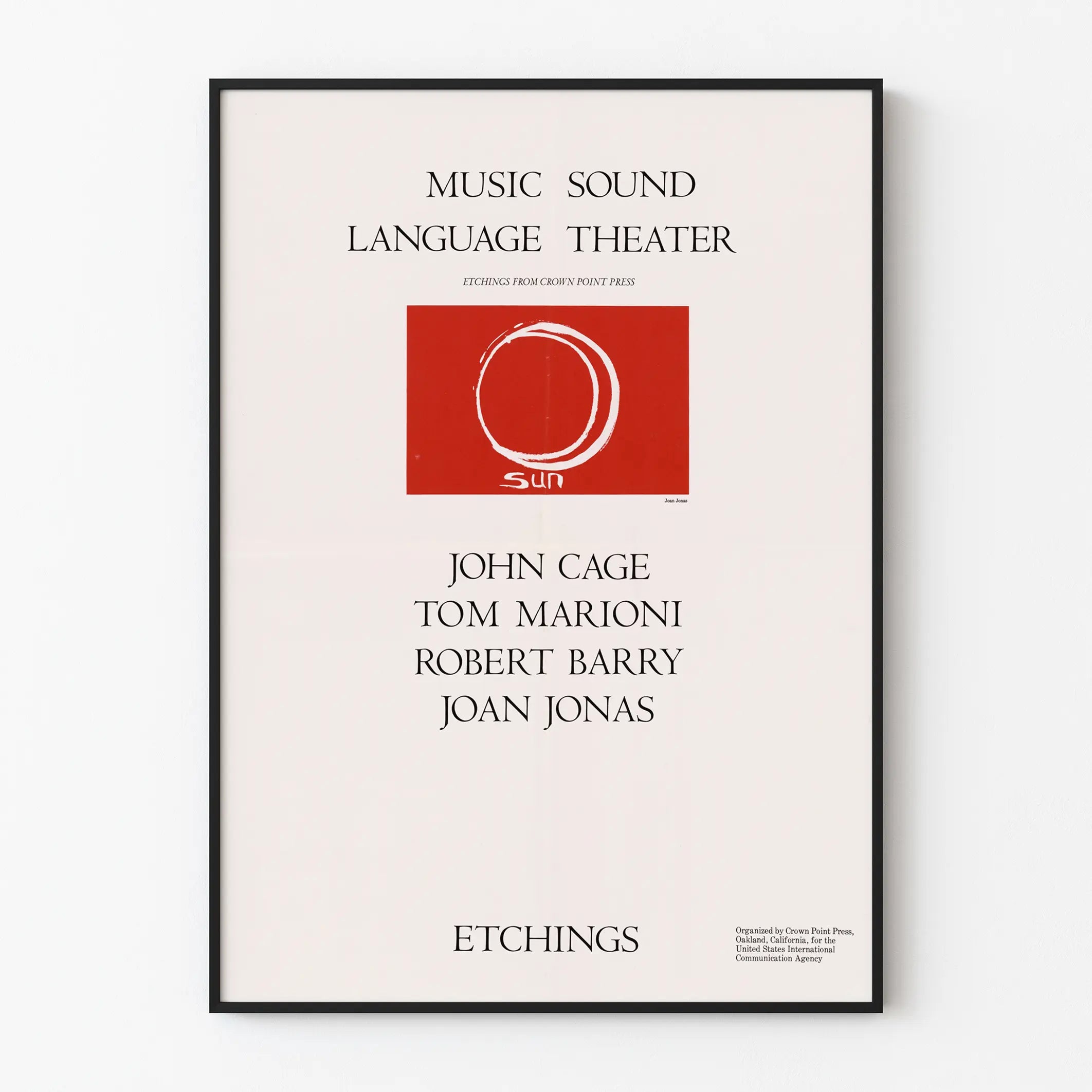 Tämä taiteellinen juliste nimeltä "Music Sound Language Theater" esittelee yksinkertaisen ja modernin koostumuksen, joka liittyy musiikkiin, ääneen, kieleen ja teatteriin. Se korostaa keskellä olevaa punavalkoista painokuvaa, joka esittää tyyliteltyä ympyrää, ja alareunassa on sana "sun", mikä luo dynaamisen kontrastin kokonaisuuteen. Tämä juliste leikkii elegantilla ja hienovaraisella typografialla, joka on aseteltu ilmavasti, korostaen visuaalin taiteellista ja käsitteellistä luonnetta. Maininta "Etchings from Crown Point Press" kertoo, että kyseessä on kaiverrustyö, mikä vahvistaa sen aitouden ja alkuperäisyyden vaikutelmaa seinäkoristeena. Useiden taiteilijahahmojen, kuten John Cagen, Tom Marionin, Robert Barryn ja Joan Jonaksen, nimet on kirjoitettu alaosaan, tuoden esiin vahvan kulttuurisen viitteen nykytaiteeseen ja performanssiin. Tämä juliste sopii täydellisesti moderniin ja taiteelliseen maailmaan, ja se on ihanteellinen sisustukseen ripauksella hienostuneisuutta ja edistyksellisyyttä. Yksinkertainen mutta ilmeikäs graafinen koostumus soveltuu hyvin kulttuurin, musiikin tai sisustussuunnittelun tiloihin. Minimalististen värien ja tunnistettavan tyylin ansiosta tämä juliste on keskeinen osa taiteellista seinäkoristetta, joka inspiroi ja herättää ajatuksia. Sen koko ja tyyli tekevät siitä sopivan valinnan nykytaiteen ystäville, jotka haluavat rikastuttaa tilaansa vaikuttavalla graafisella teoksella.