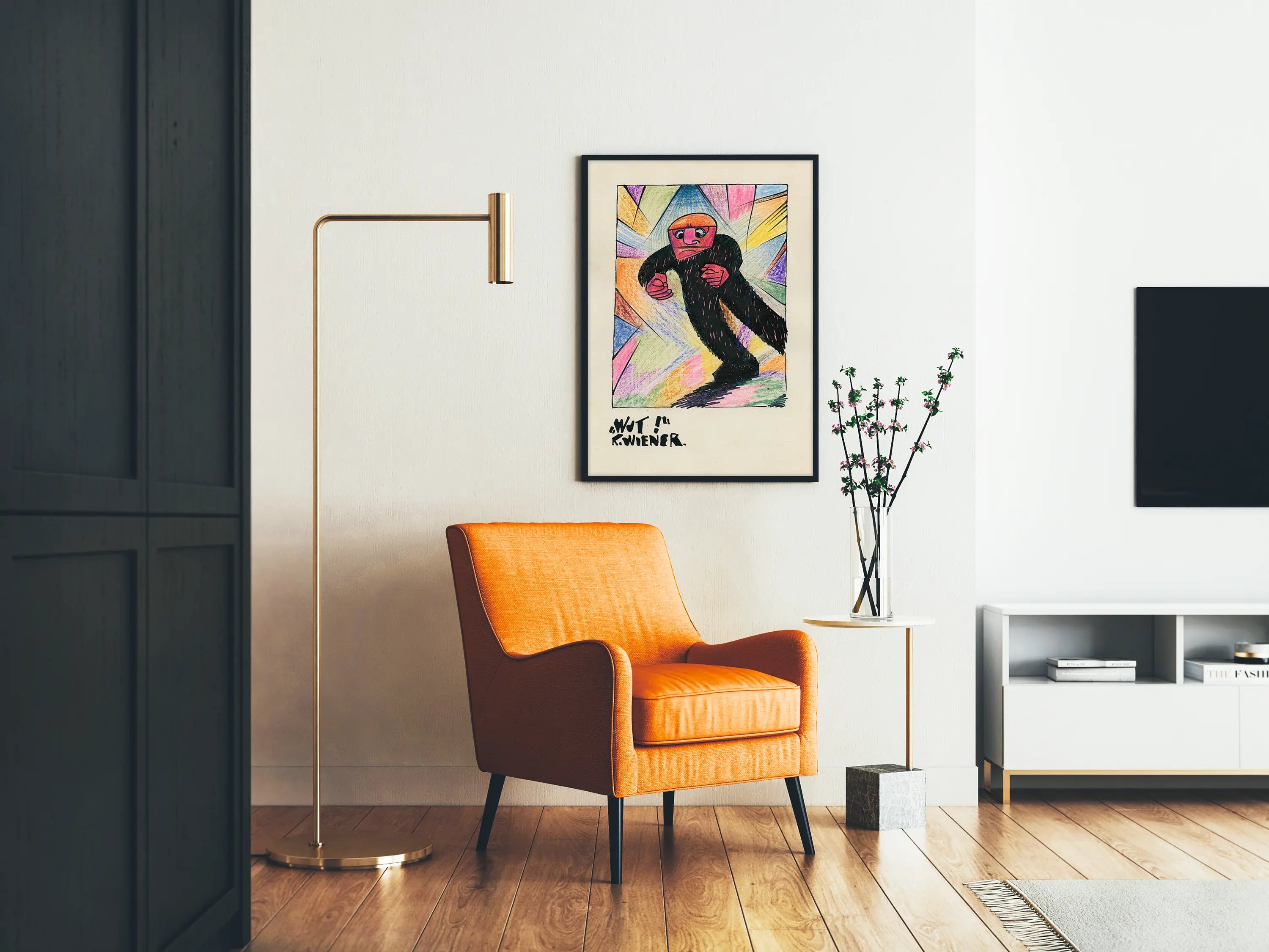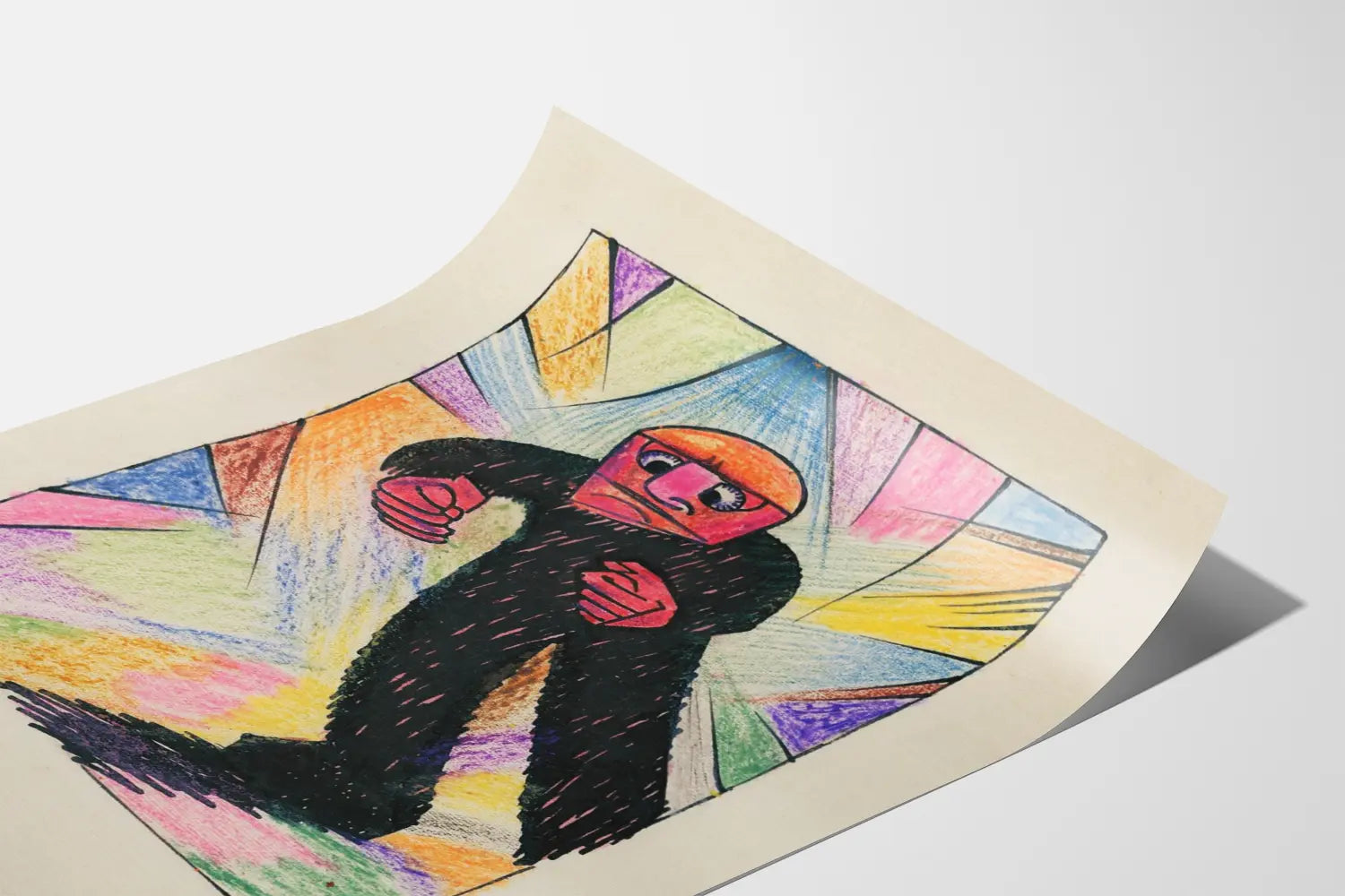 Tämä ainutlaatuinen juliste nimeltä « Wut ! » ja allekirjoitettu K. Wiener erottuu eloisalla ekspressionistisella taiteellisella tyylillään. Piirros esittää tyyliteltyä ihmishahmoa, jolla on kulmikkaita muotoja ja intensiivisen punainen kasvot, mikä välittää voimakasta tunnetta. Hahmo, pukeutuneena mustaan, vaikuttaa määrätietoisesti etenevältä abstraktissa maisemassa, jossa eloisat värit – vaaleanpunainen, sininen, oranssi, violetti, vihreä ja keltainen – yhdistyvät dynaamiseksi liukuväriksi siluetin ympärillä. Tarkoitetut piirteet ja geometrinen taustan sommittelu tuovat kokonaisuuteen energiaa, tehden tästä teoksesta rohkean valinnan seinäkoristeeksi. Juliste esittelee harmonisen yhdistelmän yksinkertaisesta viivasta ja värien rikkaudesta, mikä mahdollistaa sen sijoittamisen niin moderniin sisustukseen kuin luovaan tilaan. Omalaatuisuutensa ansiosta tämä juliste on ihanteellinen niille, jotka haluavat tuoda sisustukseensa vahvaa ja ilmeikästä taiteellista kosketusta. Olipa kyseessä toimisto, olohuone tai työpaja, värien eloisuus ja tämän julisteen ilmaisun voima tekevät siitä keskeisen osan seiniesi korostamista. Tämä alkuperäinen teos korostaa myös ainutlaatuista graafista tyyliä, joka vetää katseita intensiteetillään ja aitoudellaan, korostaen piirroksen emotionaalista voimaa. Yhteenvetona, K. Wienerin juliste « Wut ! » kutsuu löytämään raikkaan ja värikkään ilmaisun seinäkoristeen kautta, joka kykenee muuttamaan yksinkertaisen tilan persoonalliseksi paikaksi.