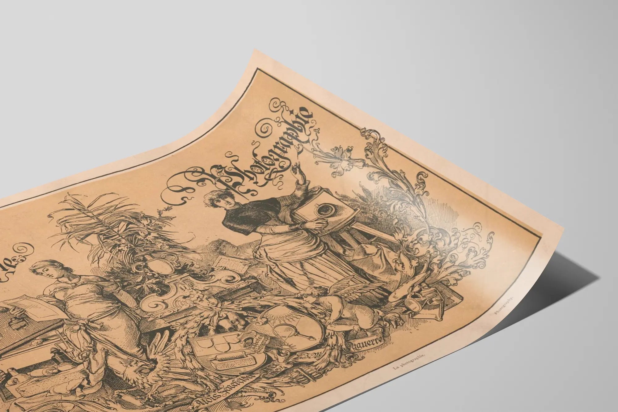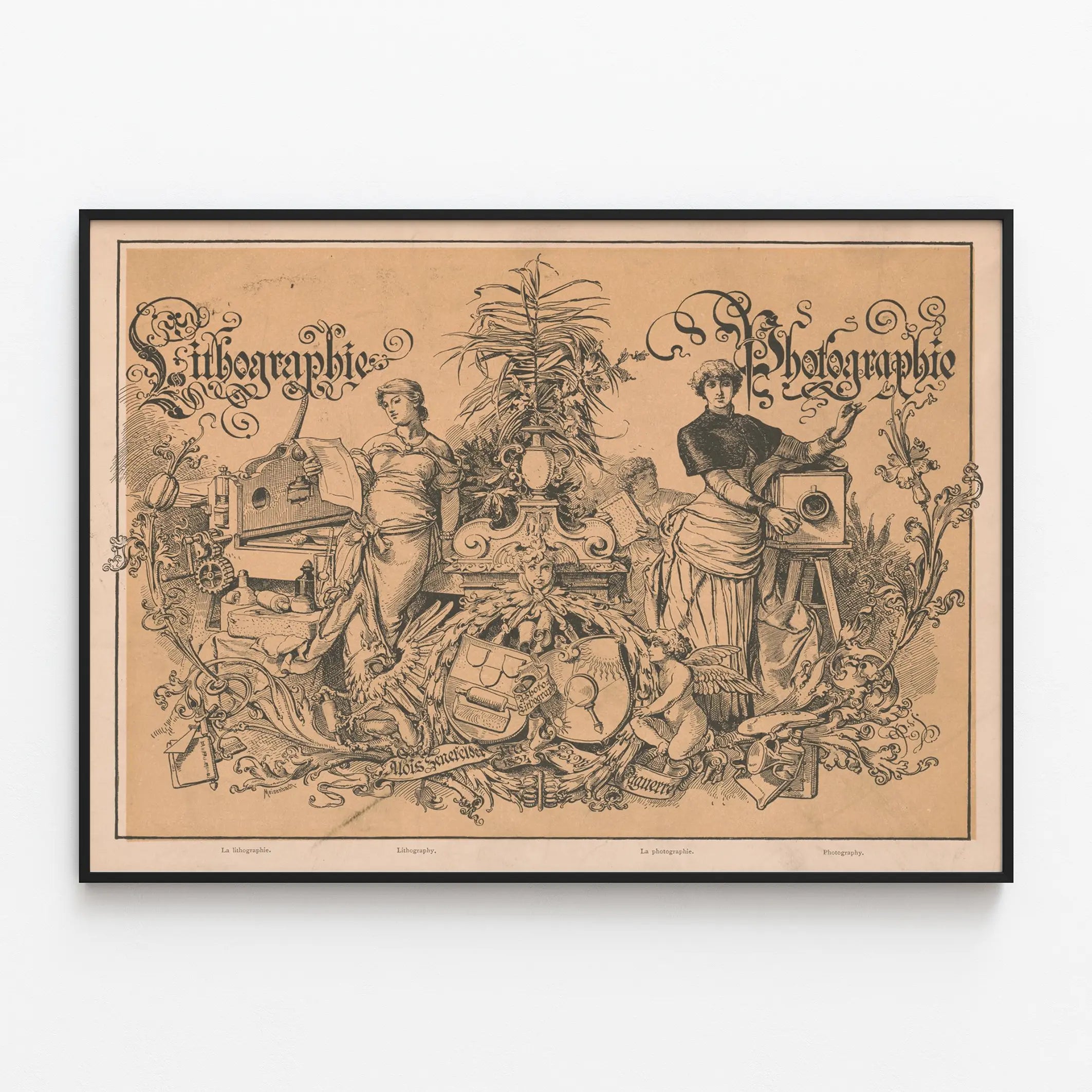 Tämä taidegrafiikka-klassikko, upeasti yksityiskohtainen, esittelee kaksi olennaista teemaa visuaalisessa taiteessa: litografia ja valokuvaus. Täydellisesti suunniteltu seinäkoristeiden harrastajille, tämä vanha kuva esittää rikkaan ja hienostuneen koostumuksen, jossa kaksi naisfiguuria edustavat kumpikin taiteellisia tekniikoita. Vasemmalla oleva nainen, joka pitää lehteä ja on ympäröity litografian symboloivilla laitteilla ja elementeillä, kontrastoi oikealla olevan naisen kanssa, joka poseeraa vanhan valokuvauslaitteen vieressä. Välissä rehevä kasvillisuus ja hienosti piirretyt koristekuviot lisäävät eleganssia koostumukseen. Kalligrafisesti kirjoitetut tekstit „litografia“ ja „valokuvaus“ vahvistavat tämän julisteen vintage- ja taiteellisen estetiikan. Tämä teos on ihanteellinen tuomaan sisätiloihisi sekä historiallista että esteettistä tunnelmaa, olipa kyseessä olohuone, toimisto tai luovuuden tila. Saatavilla julisteena tai postikorttina, se sopii helposti klassiseen tai moderniin kehykseen. Tämä seinäkoriste symboloi taiteellisten tekniikoiden kehitystä ja lisää hienostunutta vivahdetta seinille, kutsuen pohtimaan kuvien taidegrafiikan merkitystä. Anna tilallesi kulttuurinen ja graafinen sävy tämän herkästi jaevan esityksen avulla, joka kuvastaa litografian ja valokuvauksen yhdistymistä.