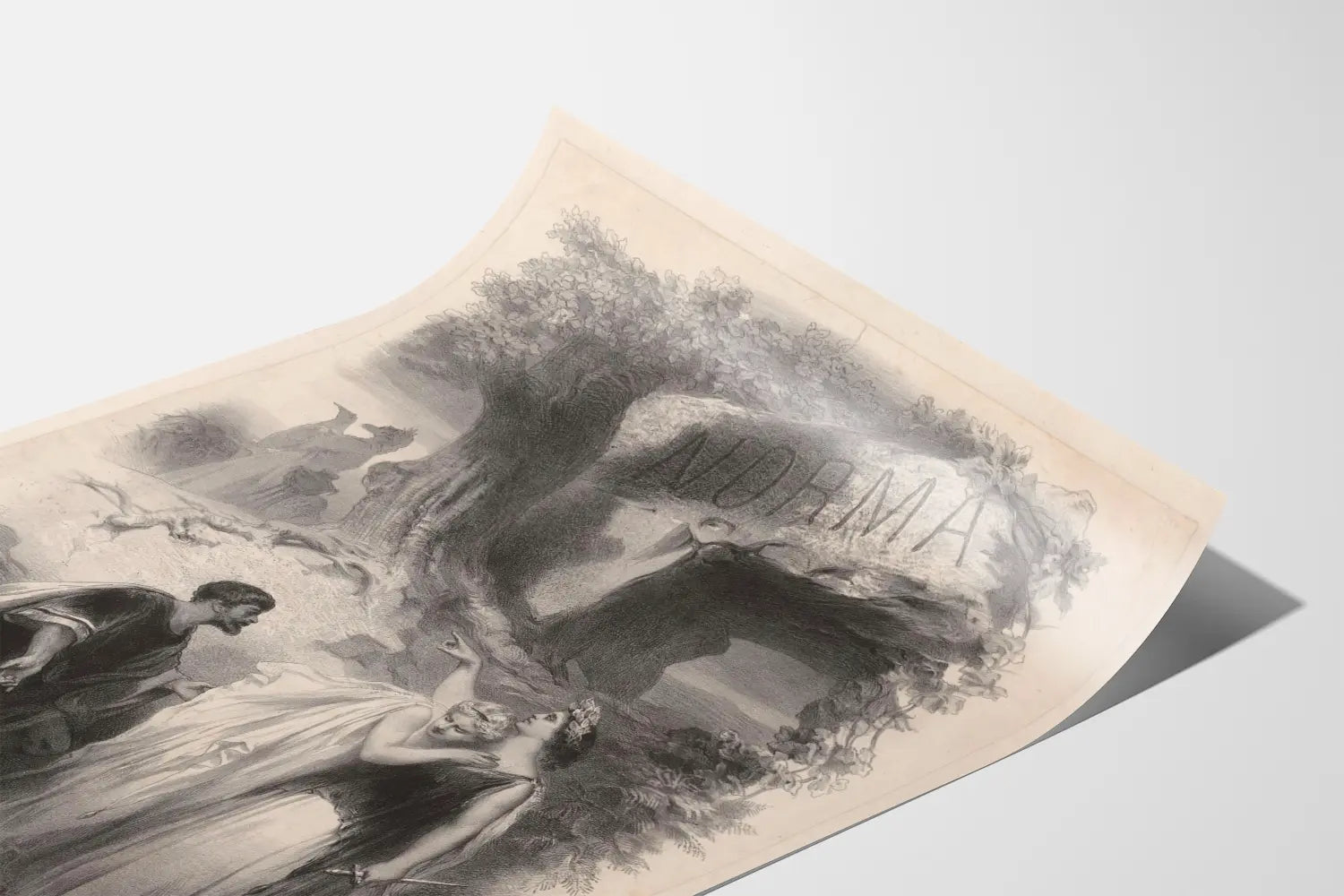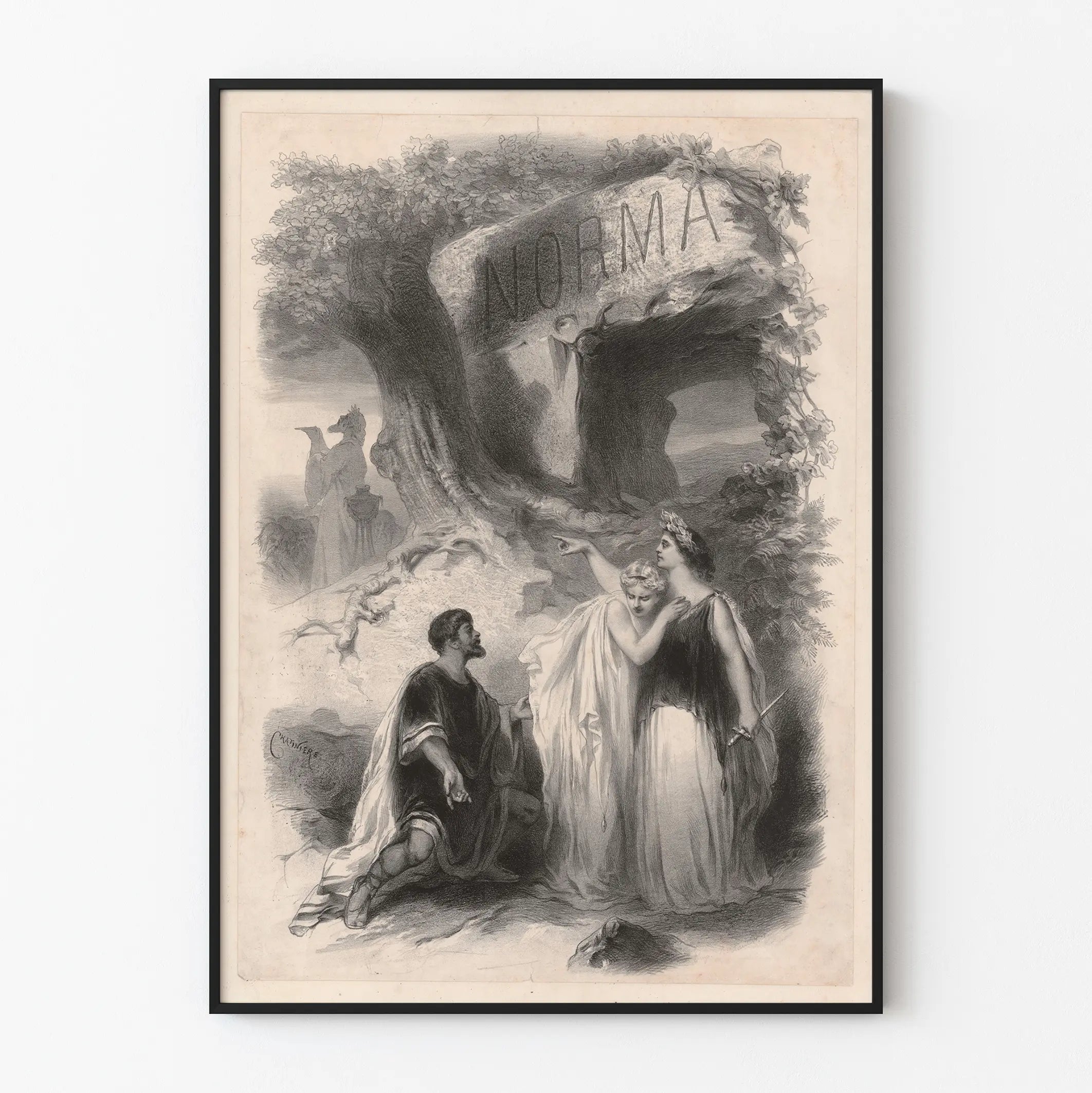 Tämä mustavalkoinen vintage juliste esittelee dramaattisen kohtauksen nimeltä "Norma". Tämä klassinen juliste, täynnä yksityiskohtia, kuvaa kolmea hahmoa suuren ontto puun rungon juurella, johon on kirjoitettu sana "NORMA". Vasemmalla polvistunut mieshahmo vaikuttaa anovan tai esittävän pyyntöä, kun taas oikealla seisovat kaksi naista ilmaisevat tukea ja päättäväisyyttä. Toisella naisista on laakeriseppele ja hän pitää pistoolia, mikä lisää kohtauksen traagista ulottuvuutta. Rungon ympärillä olevat lehdet ja juuret luovat luonnollisen kehyksen, ja taustalla näkyvät muut siluetit lisäävät kokonaisuuden salaperäistä syvyyttä. Seinälle ripustettavana koristeena tämä juliste sopii täydellisesti klassisen tai teatterimaisen tunnelman sisustukseen. Sen vanhan kaiverruksen tyyli ja hienojen varjojen leikki tuovat ripauksen eleganssia ja hienostuneisuutta. Tämä taiteellinen juliste on ihanteellinen klassisen taiteen ystäville ja oopperan harrastajille, jotka haluavat herättää draamaattisen ja historiallisesti rikkaan maailman visuaalisen esityksen kautta. Moderniin tai perinteiseen kehykseen asetettuna tämä seinäkoriste hurmaa aitoudellaan ja ajattomalla estetiikallaan. Lisäämällä tämän "Norma" -julisteen seinäkeräilyysi saat sekä koristeellisen että inspiroivan teoksen, joka kertoo kiehtovan tarinan huolellisesti toteutetun piirroksen kautta.