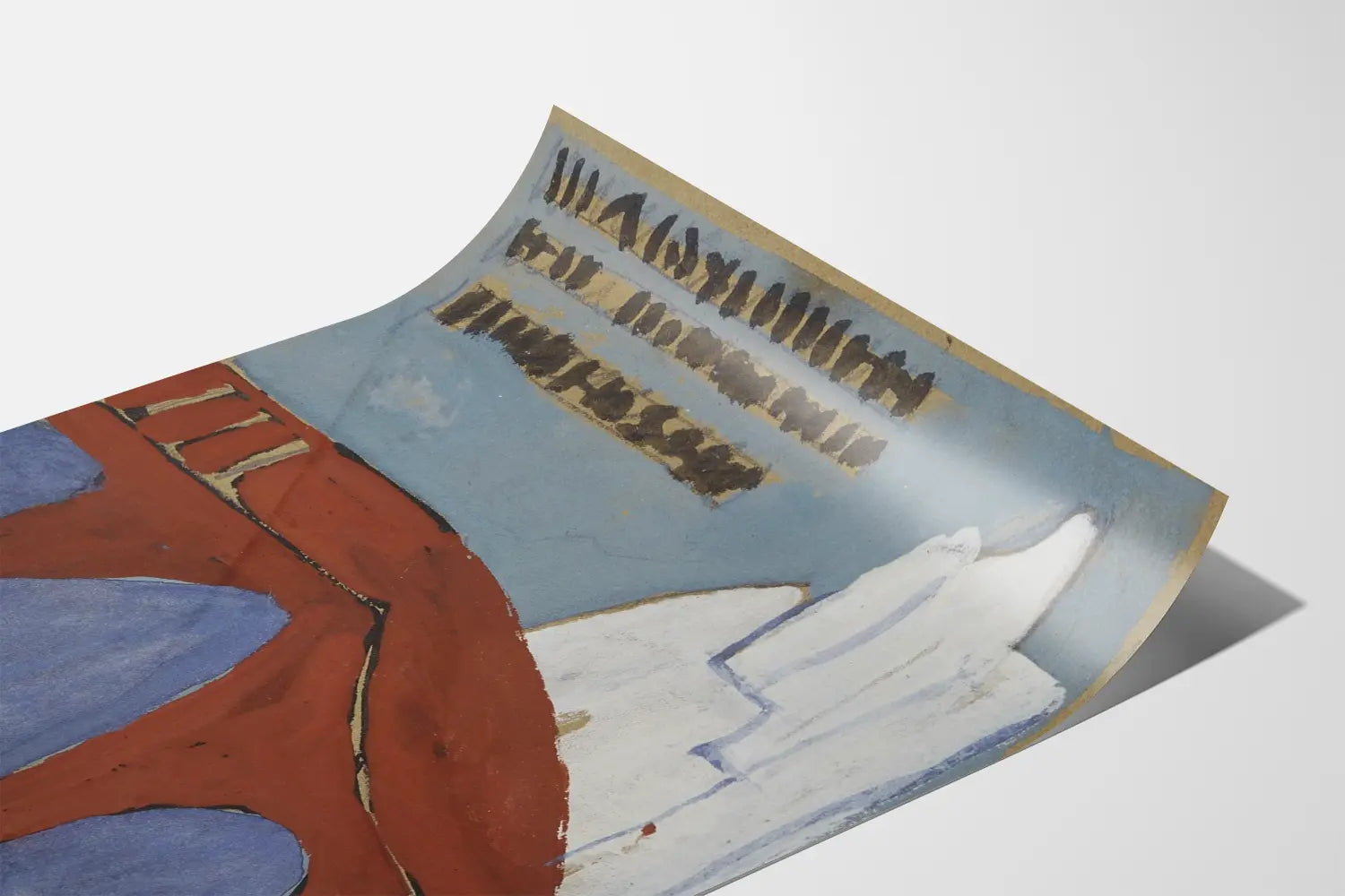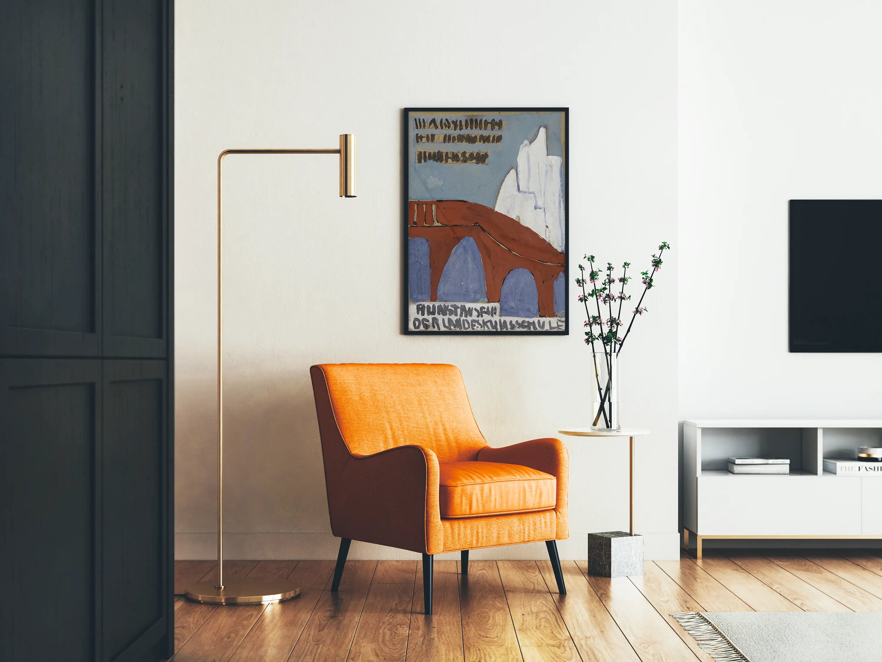 Tämä alkuperäinen juliste esittelee tunnusomaisen graafisen suunnittelun, jossa yhdistyvät arkkitehtoniset muodot ja tekstielementit. Siinä näkyy pyöreäkaareinen, ruskeanpunainen silta, joka ulottuu teoksen reunasta toiseen. Taustalla valkoiset muodot, joiden ääriviivat ovat sinertävät, vaikuttavat esittävän rakennelmaa tai tyyliteltyä maisemaa. Sinisissä ja beigen sävyissä oleva tausta luo pehmeän kontrastin etualan elementeille. Julisteen yläosassa mustat tekstirivit okranvärisellä taustalla sekä alhaalla isoilla kirjaimilla oleva otsikko viittaavat mainokseen tai ilmoitukseen, joka liittyy "Kunstmuseum der Landeskunstschuleen". Tämä modernin taiteen ja abstraktin graafisen suunnittelun inspiroima seinätaideteos on erinomainen alkuperäiseksi seinäkoristeeksi, joka tuo kulttuurista ja taiteellista tunnelmaa. Täydellinen lisä nykyaikaiseen sisustukseen tai taiteen ja historian tilaan. Se sopii helposti minimalistiseen, boheemiin tai teolliseen tyyliin. Tämä seinäkoriste kutsuu tutustumaan eurooppalaiseen taideperintöön ja tarjoaa samalla visuaalisen hienostuneisuuden vivahteen muotojen ja maalattujen tekstuurien tasapainon ansiosta. Uniikki lisä taiteen ja graafisen suunnittelun ystäville.
