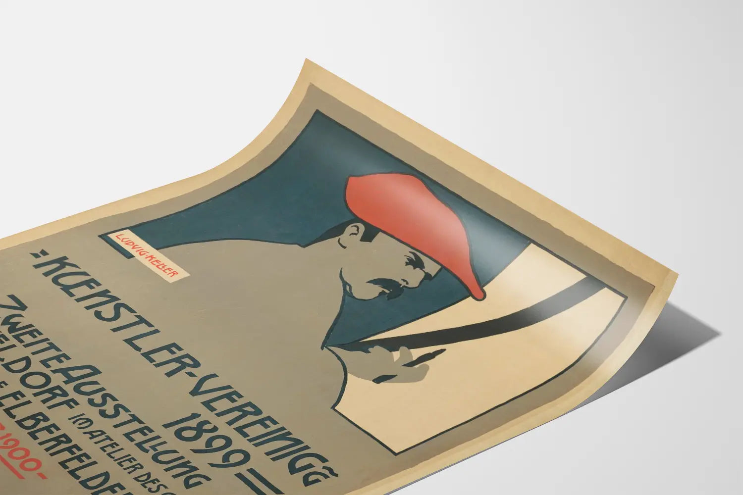 Tämä vintage- juliste esittää tyypillisen teoksen 1800-luvun lopun graafisesta tyylistä, joka mainostaa Düsseldorfin Kunstler Vereinigung -yhdistyksen toista näyttelyä vuonna 1899. Kompositio korostaa tyyliteltyä muotokuvaa miehestä, joka kantaa punaista beretiä ja pitää sivellintä, viitaten maalaustaiteen ja taiteen maailmaan. Hänen kasvonsa on piirretty sivuprofiilina, yksinkertaisin mutta ilmeikkäin piirtein, taustalla hillittyjä värejä, jotka vaihtelevat harmaan, tummansinisen ja beigen välillä. Rohkea ja kulmikas typografia täyttää julisteen alaosan, yhdistäen mustia kirjaimia ja punaisia yksityiskohtia, mikä vangitsee heti katseen. Tämä aikakauden mainosjuliste on keskeinen elementti kaikessa taiteesta ja vanhoista näyttelyistä inspiroituneessa seinäkoristeessa. Olipa kyseessä olohuone, toimisto tai luova tila, se tuo autenttisuuden ja ainutlaatuisen retro- viehätyksen. Juliste erottuu graafiselta ilmeeltään, jossa tasapaino muotojen ja yksinkertaisten linjojen välillä on korostunut. Täydellinen kehystettynä julisteena tai seinäposterina, tämä visuaalinen teos sopii erinomaisesti vintage-, teollisuus- tai taidehenkiseen sisustukseen. Se on myös kunnianosoitus taidenäyttelyiden historiaan ja aikakauden painotekniikoihin, rikastuttaen seinäkoristekokoelmaasi aidolla visuaalisella historiankappaleella. Tämän julisteen taidegrafiikan kopion valitseminen lisää kulttuurista ja esteettistä arvoa, samalla kun se korostaa vanhaa graafista suunnittelua, joka pysyy modernina ja tyylikkäänä nykyaikaisessa sisustuksessa.
