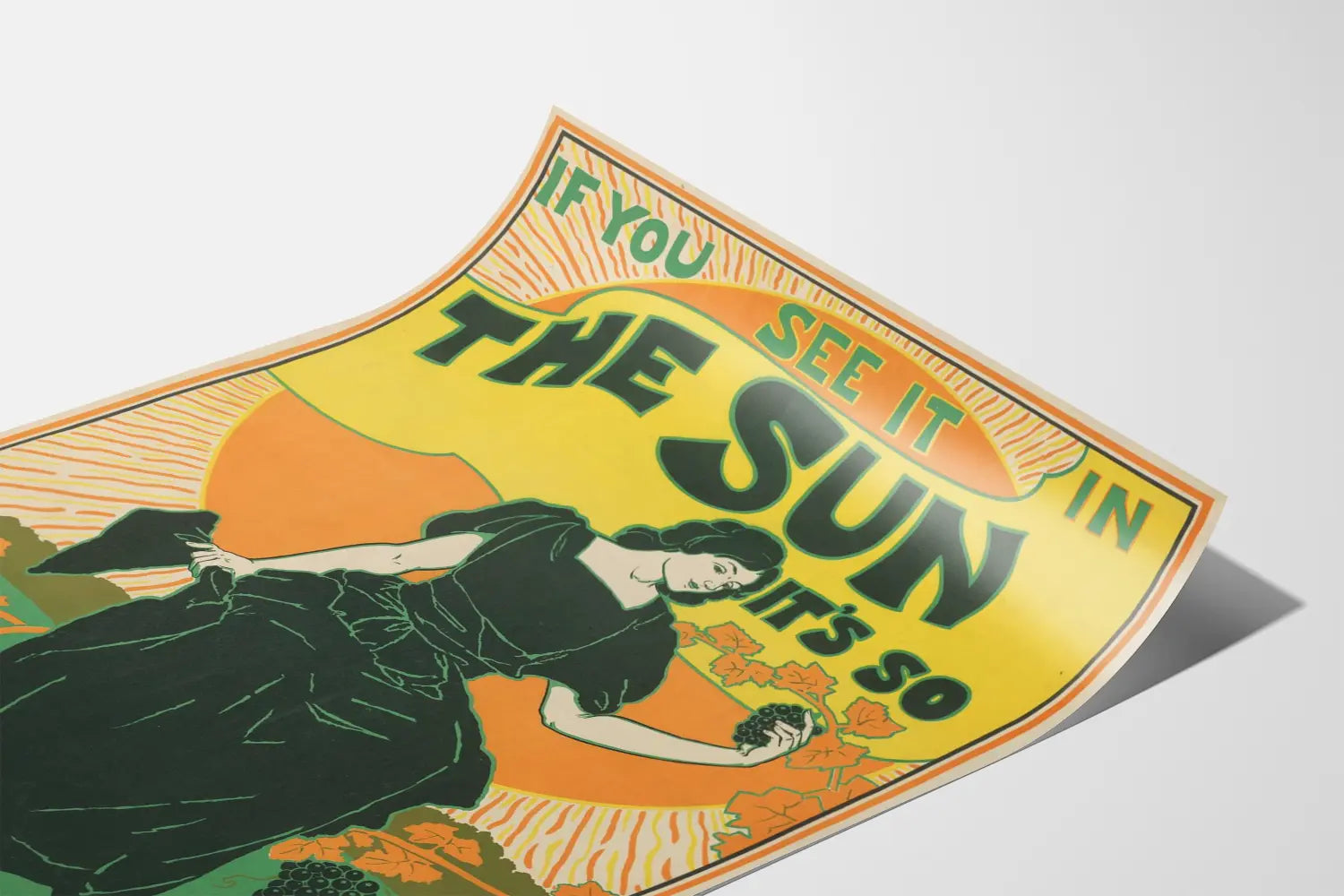 Tämä kiehtova vintage juliste tuo seinäkoristeeseesi ripauksen eleganssia ja omaleimaisuutta. Esittäen klassisen mustapukuisen naisen, joka pitää viinirypäleitä, tämä juliste korostaa rohkeaa ja värikästä typografista leikkiä lauseella "If You See It In The Sun It's So Read It". Keltaisen ja oranssin liukuvärinen tausta viestii auringon lämpöä ja valoa, kun taas lehdet ja viinirypäleet lisäävät luonnollisen ja lämpimän sävyn.
