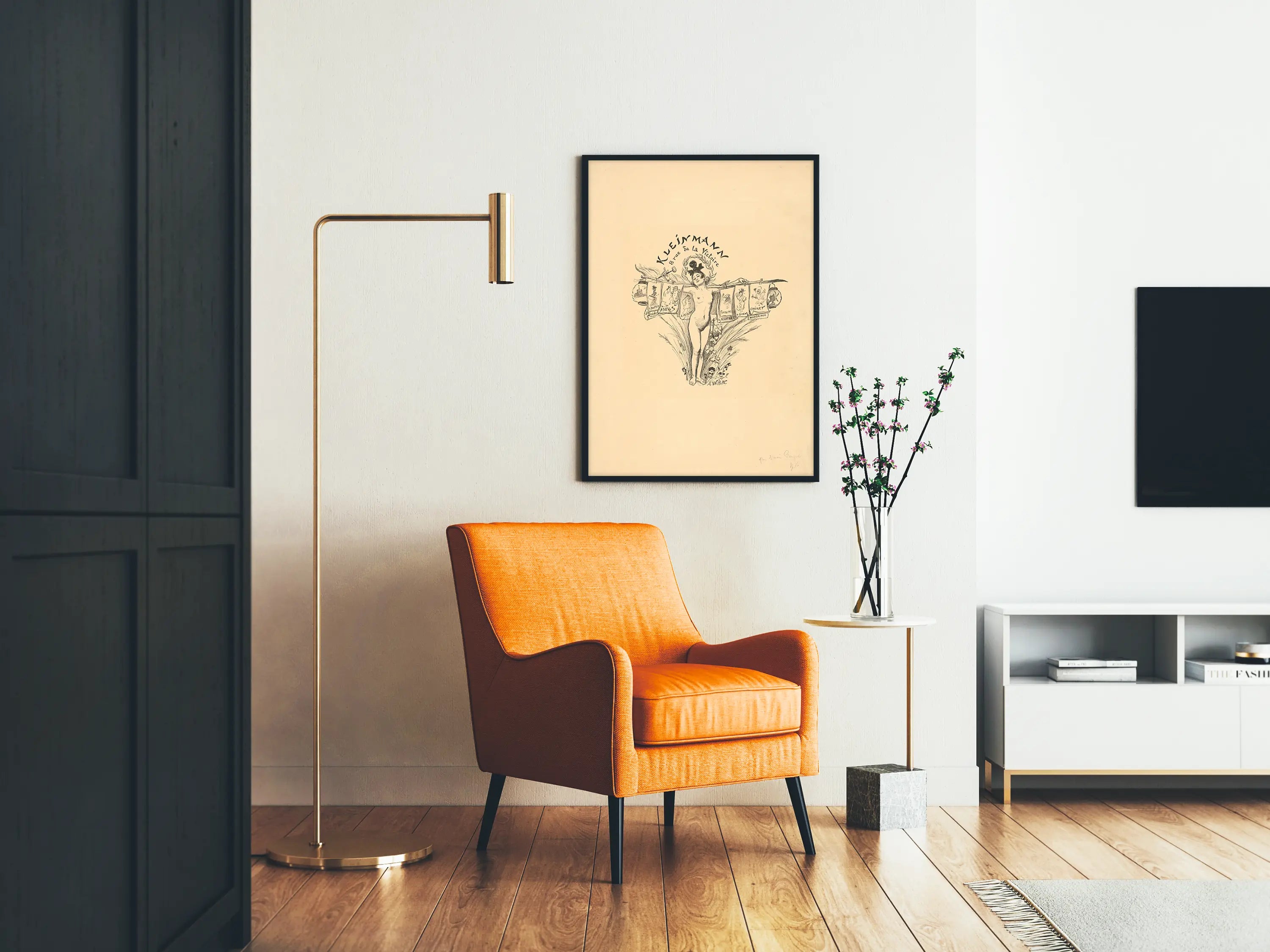Tutustu tähän A:n kuvittaman vintage-plakaatin, herkkään ja omaleimaisen seinäkoristeen. Vaaleanbeigeen taustaan sijoittuu keskelle alaston naisfiguuri, joka kantaa kasviaiheista seppelettä ja pitää käsivarsillaan vaakaa, johon roikkuvat useat pienet julisteet. Nämä sivupostereiksi tarkoitetut teokset esittävät tyyliteltyjä piirroksia nimineen, lisäten teokseen narratiivisen ulottuvuuden. Sävellystä koristavat taustalla olevat kukka-aiheiset elementit, jotka tuovat keveyttä ja hienostuneisuutta. Tämä plakaatti on ihanteellinen perinteisen ja elegantin seinäkoristeen ystäville, tarjoten retro-voiman, joka voi korostaa mitä tahansa sisätilaa. Se viittaa vanhan graafisen taiteen maailmaan, täydellinen rikastuttamaan tilaa teoksella, jossa yhdistyvät hienostunut viiva ja visuaalinen runous. Olipa kyseessä olohuone, kirjasto tai toimisto, tämä juliste sopii harmonisesti erilaisiin sisustustyyleihin, vintage-klassikosta nykyaikaiseen, ja viehättää erityisesti niitä, jotka arvostavat taiteellisia, herkästi ja yksityiskohtaisesti kuvattuja piirroksia.