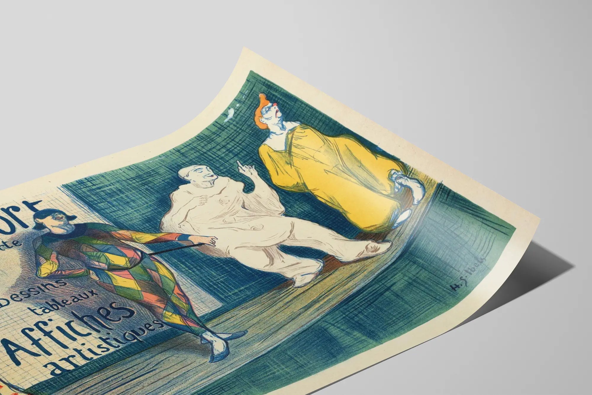 Tutustu tähän vintage-tyyliseen taiteelliseen julisteeseen Pierrefort, ainutlaatuiseen retro-tyyliseen julisteeseen, joka korostaa seinäkoristeitasi. Tämä vanha mainosjuliste esittää neljä hahmoa teatraalisissa asennoissa, joista yksi on värikäs ruutukuviin pukeutunut klovni, yksi leveästi ja värikkäästi pukeutunut hahmo, ilmeikäs valkoinen hahmo ja nainen punakuvioisessa mekossa. Tämä koostumus viittaa taiteelliseen ja esitystaiteelliseen maailmaan, mikä tekee siitä ihanteellisen lisän sisustukseesi tuomaan aitouden ja omaleimaisuuden tuntua. Piirros sisältää ohuita viivoja ja tekstuureja sinisellä taustalla, ja käsin kirjoitettu teksti ilmoittaa «Pierrefort, 12 R Bonaparte, Piirustukset, maalaukset, Taiteelliset julisteet». Tämä vanha juliste kutsuu sukeltamaan pariskuntien tai pariisilaisten teatterien ja kabareiden tunnelmaan, tehden tästä seinäkoristeesta inspiroivan ja persoonallisen. Graafisen tyylinsä ja pehmeiden värien yhdistelmän sekä kirkkaiden sävyjen ansiosta tämä taiteellinen juliste luo lämpimän ja elävän ilmapiirin, joka kaunistaa seinän tyylikkäästi. Se on täydellinen taiteen, vintage-tyylisen sisustuksen tai ajattomien mainosjulisteiden ystäville. Tämä teos sopii hyvin olohuoneeseen, toimistoon tai luovuuden tilaan, tuoden kulttuurisen ja taiteellisen sävyn. Valitsemalla tämän julisteen valitset seinäkoristeen, joka on sekä historiallinen että esteettinen, yhdistäen tilasi esitysten henkeen ja käsin piirrettyjen julisteiden perinteeseen. Jokainen graafinen yksityiskohta, typografiasta hahmojen ilmeisiin, on kutsu taiteelliseen pakomatkaan ja koristeelliseen hienostuneisuuteen.