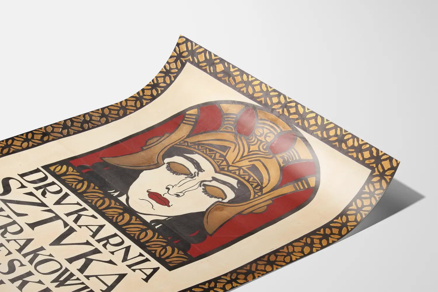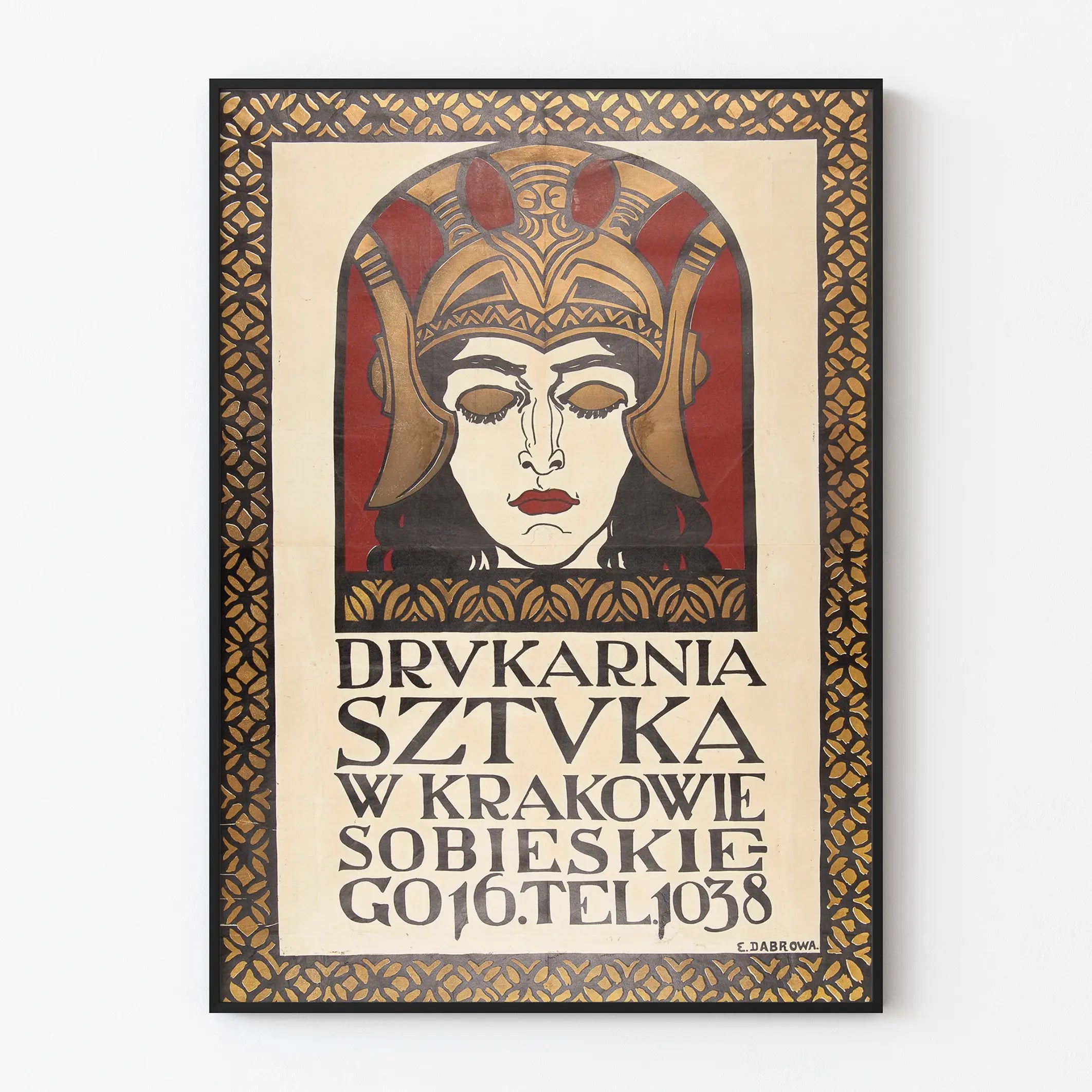 Tämä vaikuttava vintage juliste esittelee tyylitellyn pään varustettuna kypärällä, piirretty pääasiassa kullan, mustan ja syvän punaisen värein, ja kehystetty toistuvalla geometrisella koristekuviolla. Tämä ainutlaatuinen juliste heijastaa perinteistä ja voimakasta taiteellista tyyliä, yhdistäen yksinkertaisen graafisen ilmeen ja vahvan visuaalisen vaikutelman. Yläkirjaimin kirjoitettu, hillitty ja elegantti typografia mainitsee "Drukarnia Sztuka w Krakowie", Krakovan kaupungissa sijaitsevan taiteellisen painotalon, sekä yhteystiedot, mikä antaa sille aitoa aikakauden charmia.