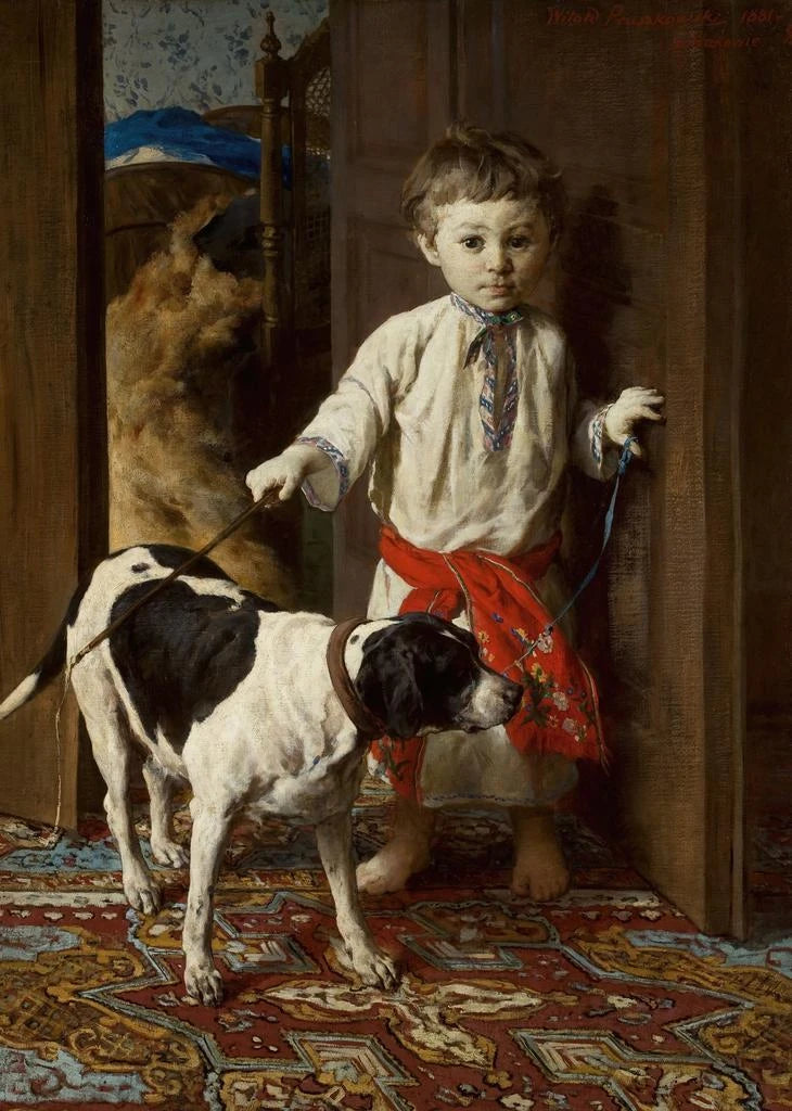 Witold Pruszkowskin teos "Fils de l'artiste avec un chien" on koskettava teos, joka tallentaa intiimin hetken lapsen ja hänen uskollisen kumppaninsa välillä. Pehmeät värit ja hienovaraiset yksityiskohdat luovat lämpimän ja perheen onnellisuuden tunnelman. Valo näyttelee tärkeää roolia, valaisten kasvoja ja luoden emotionaalisen yhteyden katsojan ja hahmojen välille. Pruszkowski onnistuu ikuistamaan tämän arkipäivän hetken herkkyydellä, joka resonoi syvästi, ja kunnioittaa lapsuuden viattomuutta.