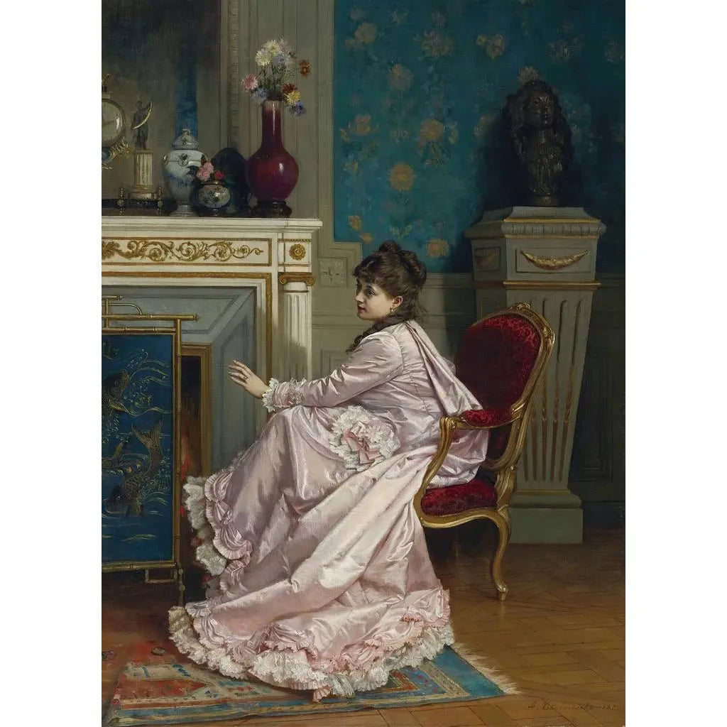 Dans cette taidegrafiikka d'Au coin du feu, l'artiste Auguste Toulmouche nous plonge dans une atmosphère douce et réconfortante. La composition met en avant une femme assise près d'un foyer, entourée de lueurs dorées qui dansent sur les murs. Les couleurs chaudes, dominées par des nuances de rouge et d'orange, créent une ambiance intime, presque nostalgique. La technique de Toulmouche, qui mêle habilement le réalisme à une touche de romantisme, invite le spectateur à s'imaginer dans ce moment de tranquillité. Chaque détail, du tissu de la robe de la femme aux reflets dans le feu, témoigne d'un soin méticuleux et d'une sensibilité artistique.