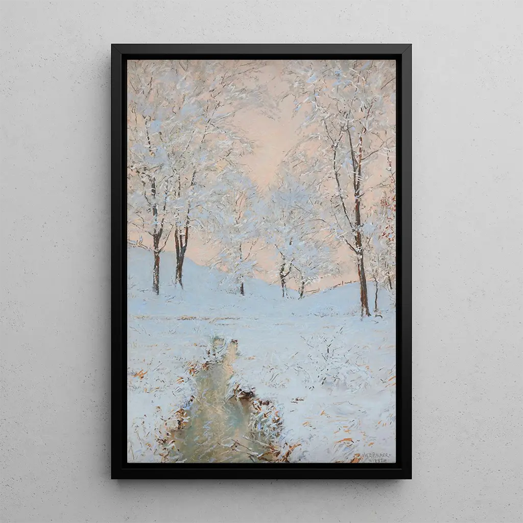 Kohteessa "Lueur d'hiver" Walter Launt Palmer vangitsee talvimaiseman taianomaisen tunnelman pehmeässä valossa. Sävymaailma on hallitsevaan sinisen ja valkoisen kylmiin sävyihin, mikä viestii talvipäivän rauhallisuudesta. Paljaat puut, kevyesti lumipeitteiset, kohoavat majesteettisesti, kun taas kirkas taivas paljastaa kultaisia sävyjä. Taiteilijan taito yhdistää taitavasti realismia impressionistiseen tunnelmaan luo rauhallisen ja pohdiskelevan ilmapiirin, kutsuen katsojan uppoutumaan tähän lumottuun tauluun.
