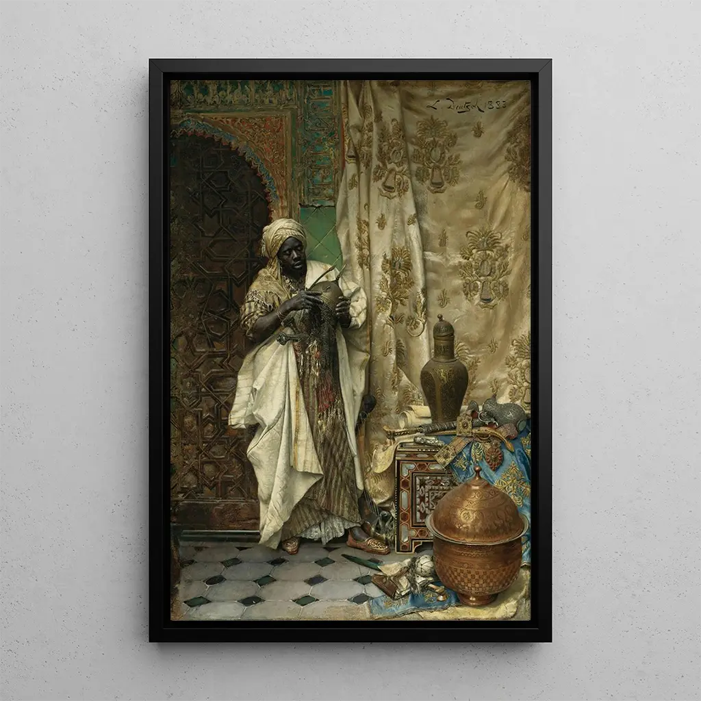 Taidegrafiikka "L'Inspection" Ludwig Deutschilta sukeltaa rikkaaseen itämaiseen maailmaan yksityiskohtia myöten. Tämä taidegrafiikka, lämpimien värien ja kultaisien sävyjen kanssa, luo mysteerin ja hienostuneisuuden tunnelman. Kompositio on huolellisesti suunniteltu, korostaen vuorovaikutuksessa olevia hahmoja, jotka on ympäröity tyypillisillä itämaisilla arkkitehtonisilla elementeillä. Deutschin tekniikka, joka yhdistää realismia ja romantiikkaa, mahdollistaa paitsi hahmojen piirteiden, myös heidän ympäristönsä olemuksen vangitsemisen. Jokainen sivellinvedos tuntuu kertovan tarinan, kutsuen katsojan uppoutumaan tähän kiehtovaan kohtaukseen.
