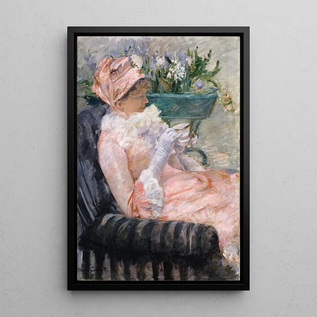 Dans cette œuvre, Mary Cassatt capture un moment de tendresse et de complicité entre deux femmes autour d'une tasse de thé. Les couleurs douces et pastel, typiques de son style, créent une atmosphère chaleureuse et apaisante. La lumière naturelle qui pénètre par la fenêtre met en valeur les détails des visages et des vêtements, accentuant l'intimité de la scène. La composition, centrée sur les personnages, invite le spectateur à s'immiscer dans ce moment de partage, où le temps semble suspendu. La technique impressionniste de Cassatt, avec ses coups de pinceau fluides, renforce la sensation de mouvement et de vie, rendant cette taidegrafiikka de "La tasse de thé" particulièrement vivante.