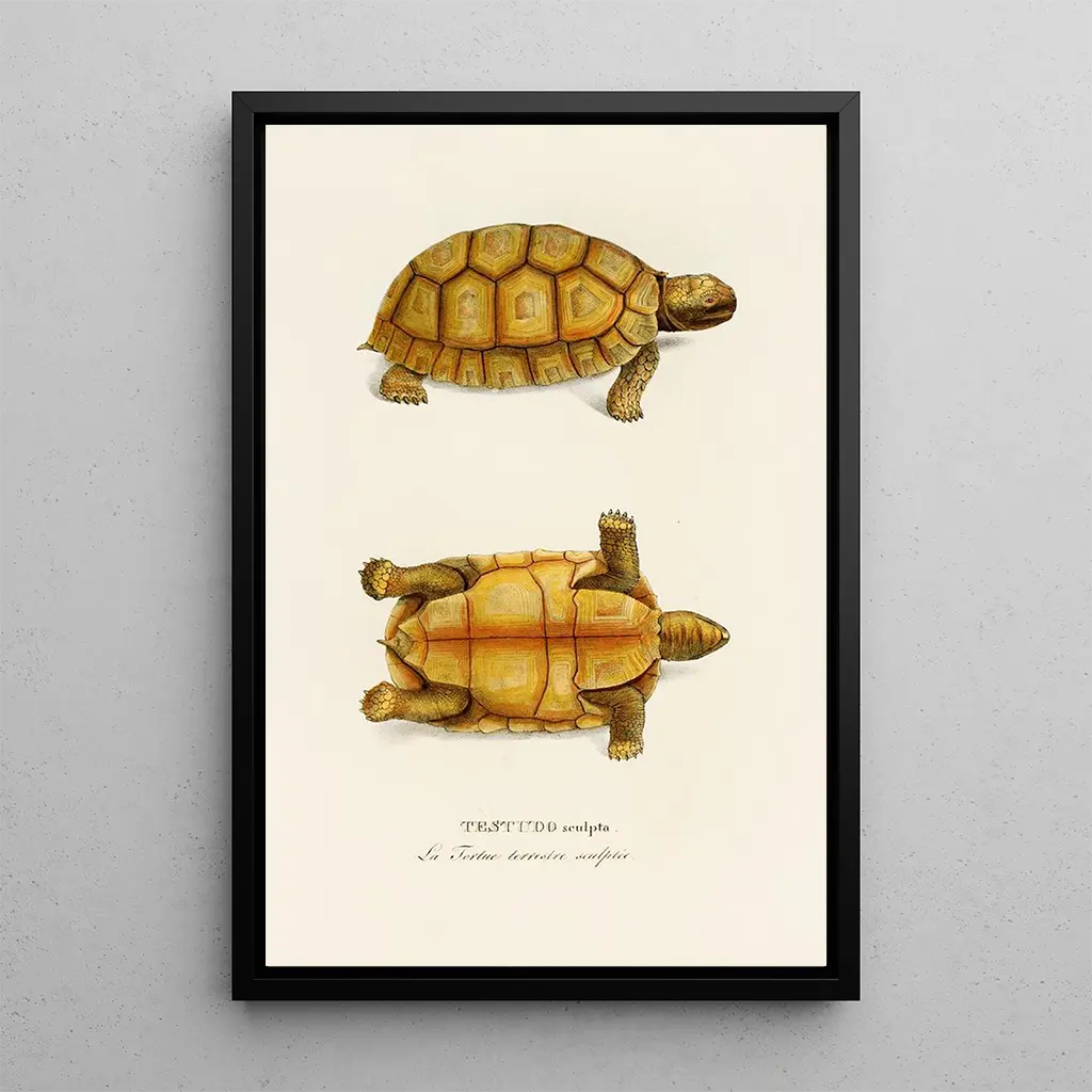 Testudo Sculpta, Johann Baptist von Spixin merkittävä taidegrafiikka, johdattaa meidät maailmaan, jossa luonnon kauneus paljastuu hienovaraisesti. Tämä taidegrafiikka korostaa kilpikonnaa, viisauden ja pitkäikäisyyden symbolia, esitettynä poikkeuksellisen tarkasti. Maalajit, jotka ovat maanläheisiä ja vihreän sävyisiä, luovat rauhoittavan ja pohdiskelevan ilmapiirin. Taiteilijan tekniikka, yhdistäen akvarellin ja piirtämisen, mahdollistaa yksityiskohtien, kuten kilpikonnan kilven ja ympäröivien tekstuurien, tarkkanäköisen tallentamisen, kutsuen katsojan ihmettelemään luonnon huolellisuutta.