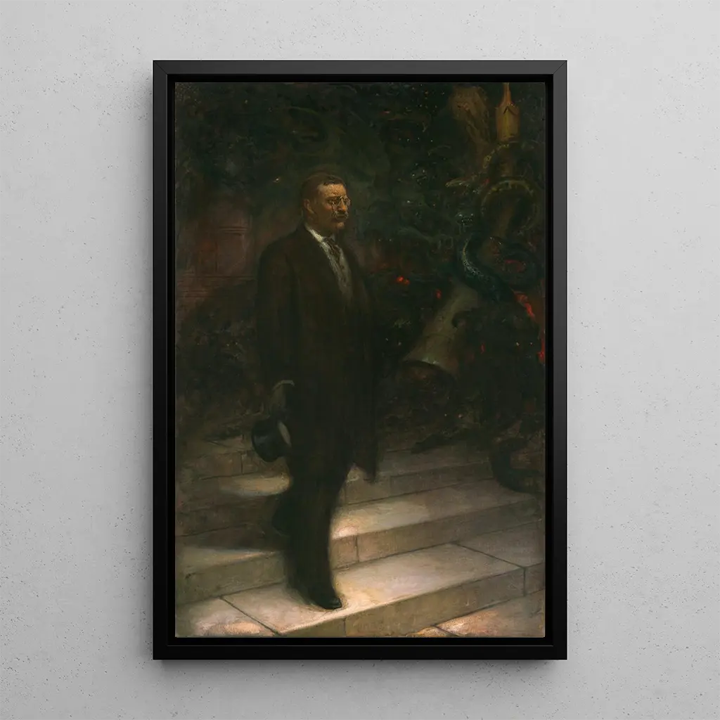 Tässä vaikuttavassa teoksessa Sigismund de Ivanowski vangitsee Theodore Rooseveltin, Yhdysvaltojen 26. presidentin, olemuksen. Maalaus huokuu havaittavaa voimaa ja päättäväisyyttä, kuvastaen Rooseveltin dynaamista luonnetta. Rikkaat värit ja huolelliset yksityiskohdat hänen puvussaan ja ilmeessään välittävät vaikutelman voimasta ja johtajuudesta. Ivanowskin käyttämä klassinen taidegrafiikan tekniikka antaa tälle reproduktiolle historiallista syvyyttä, kunnioittaen miestä, joka on jättänyt jälkensä aikakauteensa sitoutumisellaan ja visionsa.