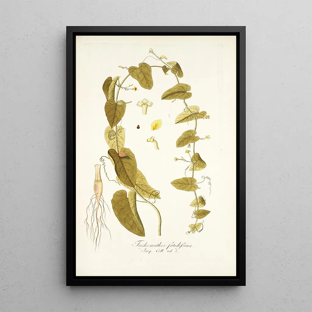Trichosanthes foetidissima -taidegrafiikan reproduktio on rohkea koristeellinen valinta, joka piristää mitä tahansa tilaa. Olipa kyseessä olohuone, toimisto tai makuuhuone, tämä taulu tuo raikkautta ja eksoottisuutta. Sen tulostuslaatu ja väritarkkuus tekevät siitä houkuttelevan teoksen kaikille, jotka arvostavat luonnon kauneutta. Sisällyttämällä tämän kankaan osaksi sisustustasi luot lämpimän ja inspiroivan ilmapiirin, samalla kun kunnioitat trooppisen kasviston rikkautta.