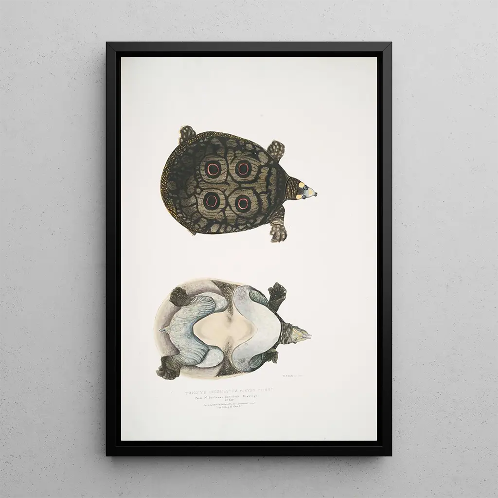 Trionyx ocellé Tryonix ocellatus -taidegrafiikka, jonka on signeerannut John Edward Gray, johdattaa meidät kiehtovaan maailmaan, jossa vesieläimet paljastuvat loistokkaasti. Teoksen koostumus korostaa täplikkäitä kilpikonnankuoria, jotka heijastavat vihreän ja sinisen sävyjä, muistuttaen jokien syvyyksiä. Taiteilijan tekniikka, yhdistäen tarkkuutta ja hienostuneisuutta, luo sekä realistisen että runollisen tunnelman, kutsuen katsojan ihailemaan tämän usein tuntemattoman eläimen kauneutta. Pienten yksityiskohtien, kuten suomujen ja veden heijastusten, vivahteet lisäävät teokseen lähes elävän ulottuvuuden.