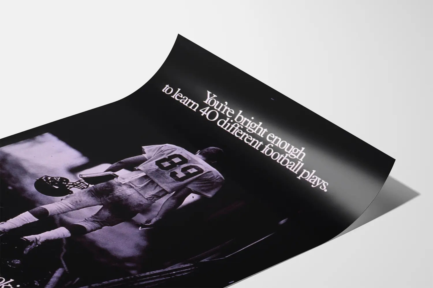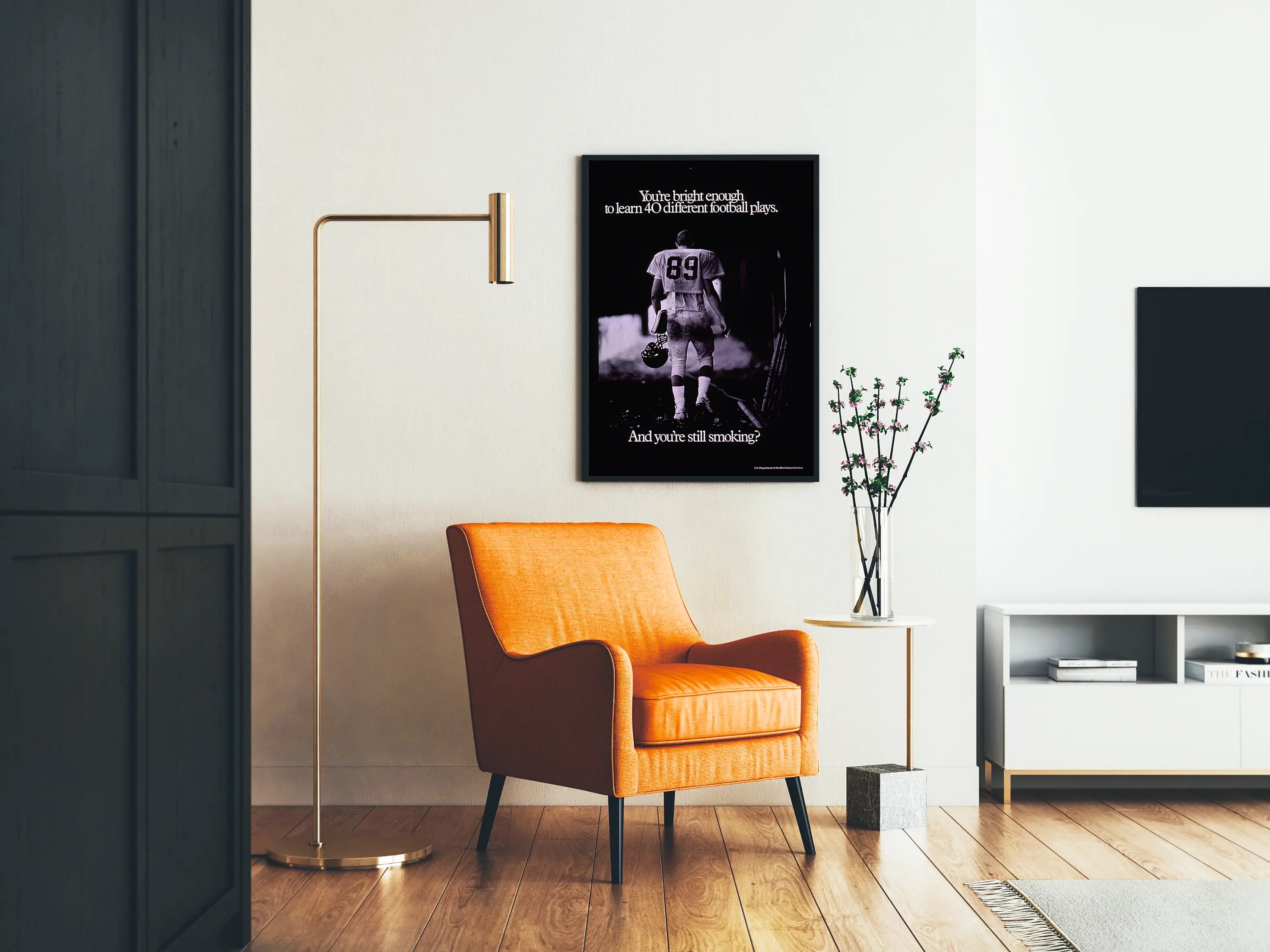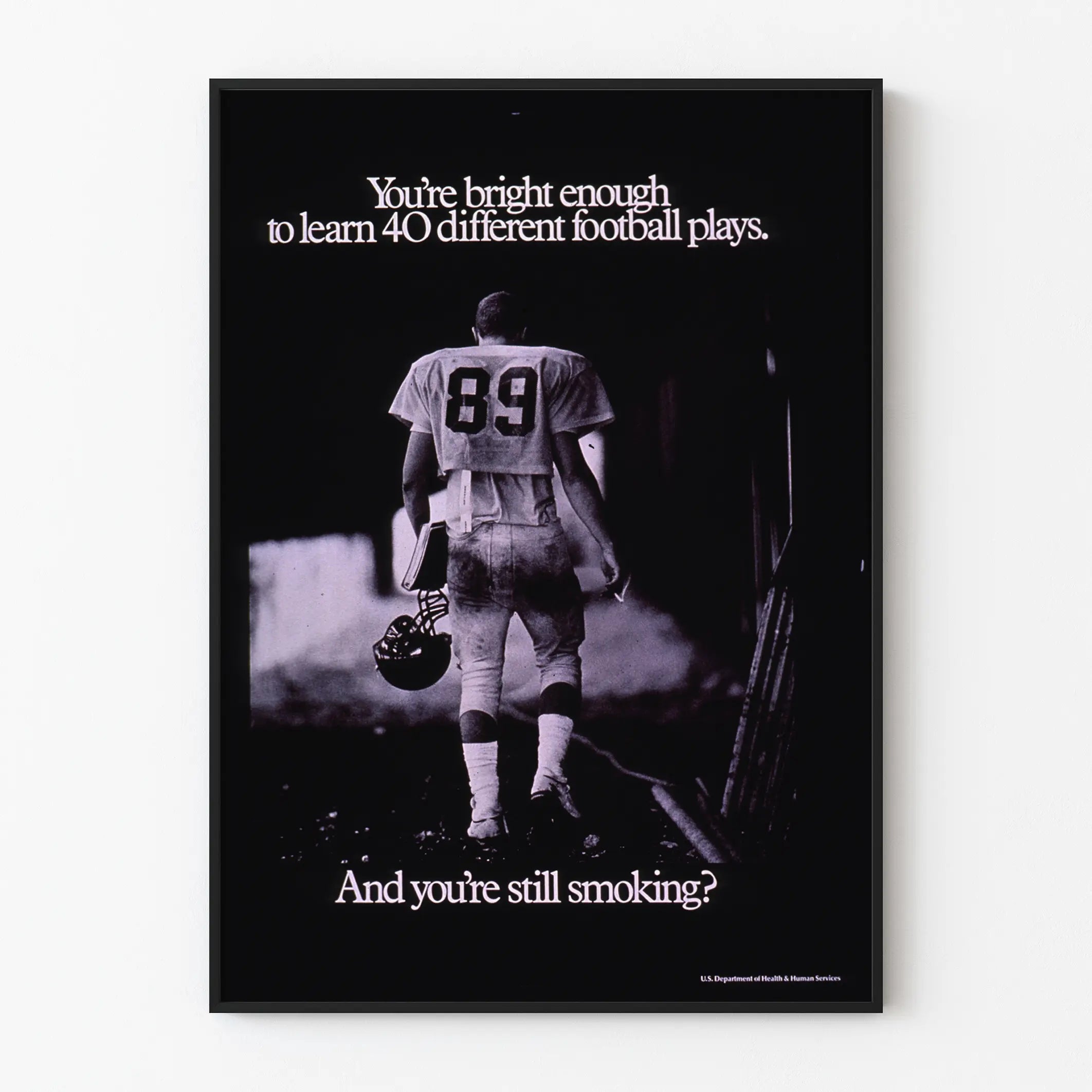 Tämä mustavalkoinen juliste esittää amerikkalaisen jalkapalloilijan selkäpuolelta, hänellä on numerolla 89 varustettu paita ja hän pitää kypäräänsä kädessään. Pelaaja kävelee synkässä ja sumuisessa ympäristössä, luoden intensiivisen ja draamaattisen tunnelman. Kuvan yläosassa oleva teksti kertoo: „Olet tarpeeksi älykäs oppimaan 40 erilaista jalkapallopeliä.“ ja alhaalla: „Ja silti poltat?“ – selkeä ja voimakas viesti, joka yhdistää älykkyyden ja elämäntavan valinnan, kannustaen tupakoinnin lopettamiseen. Tämä graafinen teos on erityisen suunnattu urheilun ystäville, erityisesti amerikkalaisen jalkapallon fanille, ja herättää yleisön tietoisuuden tupakan vaaroista suoralla ja harkitulla sävyllä. Sen yksivärinen muotoilu ja realistinen tyyli tuovat autenttisen ja vaikuttavan lisän seinäkoristeeseen. Ihanteellinen sisustuselementti makuuhuoneeseen, toimistoon tai liikuntatilaan, tämä tupakoinnin vastainen juliste yhdistää sitoutumisen ja tyylin. Se tarjoaa inspiroivan ulottuvuuden vahvan viestinsä ja päättäväisen pelaajahahmonsa ansiosta. Täydellinen motivoivan ilmapiirin luomiseen, tämä seinäkoriste sopii myös urheilu- tai oppimisympäristöön. Tämä juliste edistää urheilullista ja sitoutunutta sisätilaa, samalla herättäen pohdintaa elämäntapavalinnoista ja sinnikkyydestä.